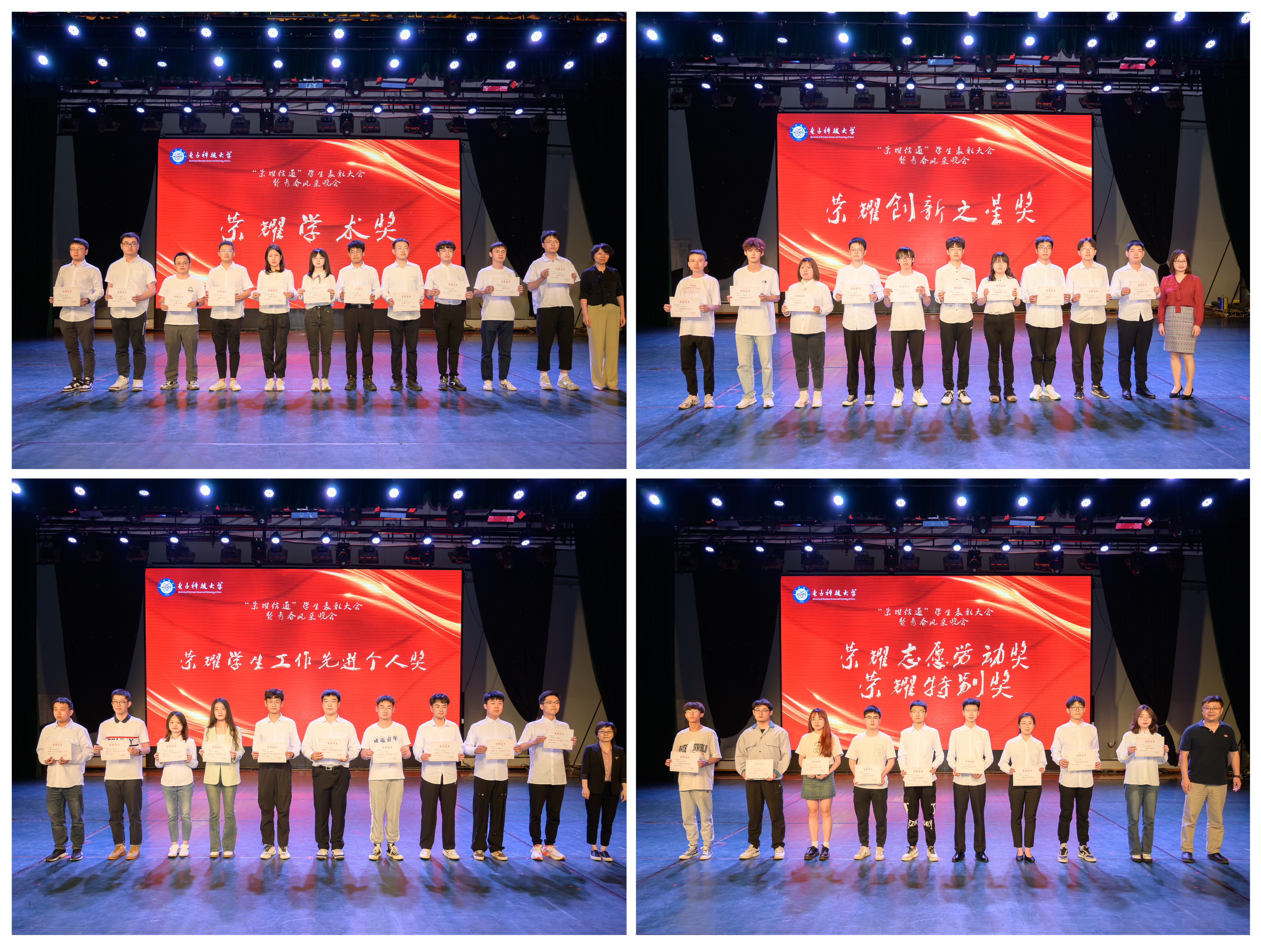 颁奖环节在冷甦鹏书记宣读了表彰决定后正式开始,本次荣耀信通表彰分为四个板块,在《求实求真·勤学信通》板块,将“荣耀学术奖”、“荣耀创新之星奖”表彰给求实求真,勇于创新的信通学子;在《大气大为·奉献信通》板块,将“荣耀学生工作先进个人奖”、“荣耀志愿劳动奖”、“荣耀特别奖”表彰给乐于奉献,勇担责任的信通学子;在《热血青春·多彩信通》板块,将“荣耀文艺之星奖”、“荣耀体育之星奖”、“荣耀美育之星奖”表彰给才艺双全,朝气蓬勃的信通学子;在《志成精英·杰出信通》板块,将“荣耀信通年度组织”、“荣耀班级体奖”、“荣耀宿舍奖”颁发给为同学们做出示范引领的杰出集体,最后将“荣耀信通年度人物”表彰给全面发展,表现卓越的学生先进个人,获奖同学在领奖台上也给2022级的信通学子们带来了鼓励和寄语。