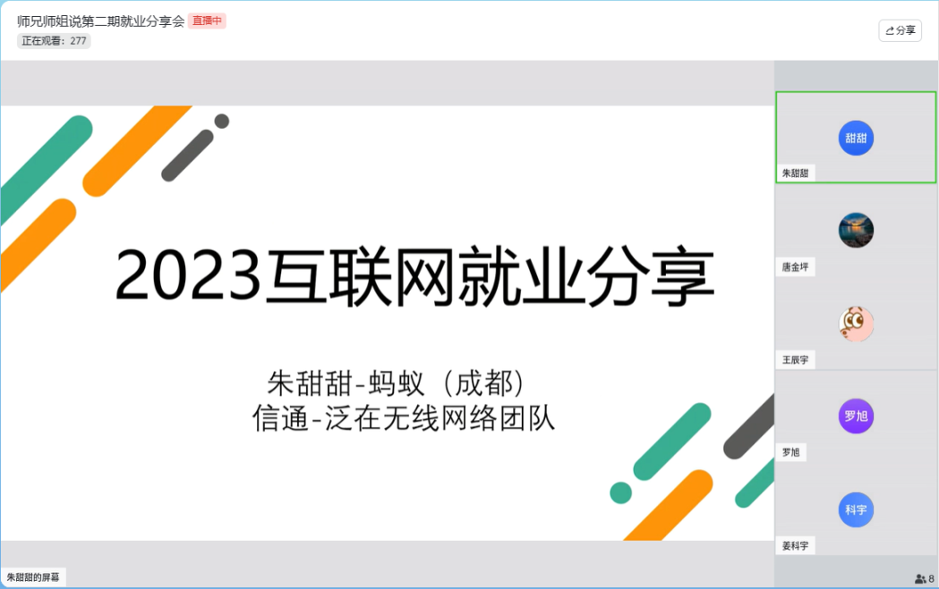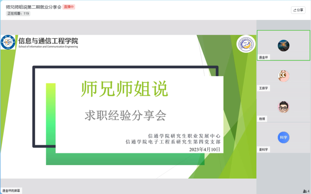 2023年4月10日晚,william英国中文研究生职业发展中心联合电子工程系研究生第四党支部在线上成功举办“师兄师姐说”第二期求职经验分享活动。此次活动邀请到签约国家电网、天翼云、中兴通讯、蚂蚁蓉信和中电科30所的五位应届毕业生,吸引近300名学生参与。