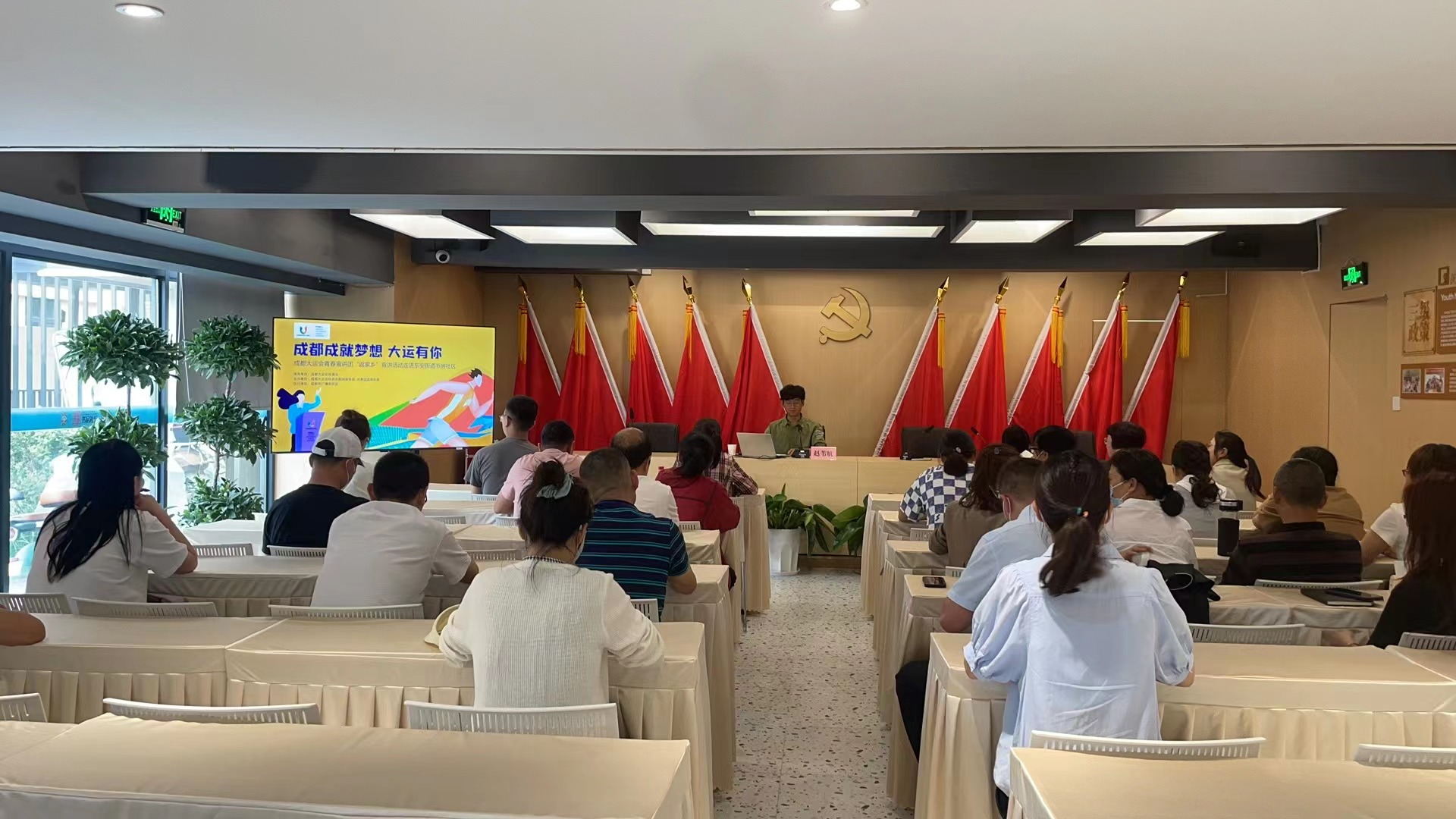 5月18日,为进一步营造“爱成都·迎大运”的浓厚氛围,向全民推广大运知识、传递大运精神,william英国中文“信仰之光”大学生新思想宣讲团成员赵苇航走进成都市社区基层,代表成都大运会青春宣讲团以“践行青春志愿 共赴大运盛会”为题面向东安街道40余名党员代表、居民代表开展宣讲。