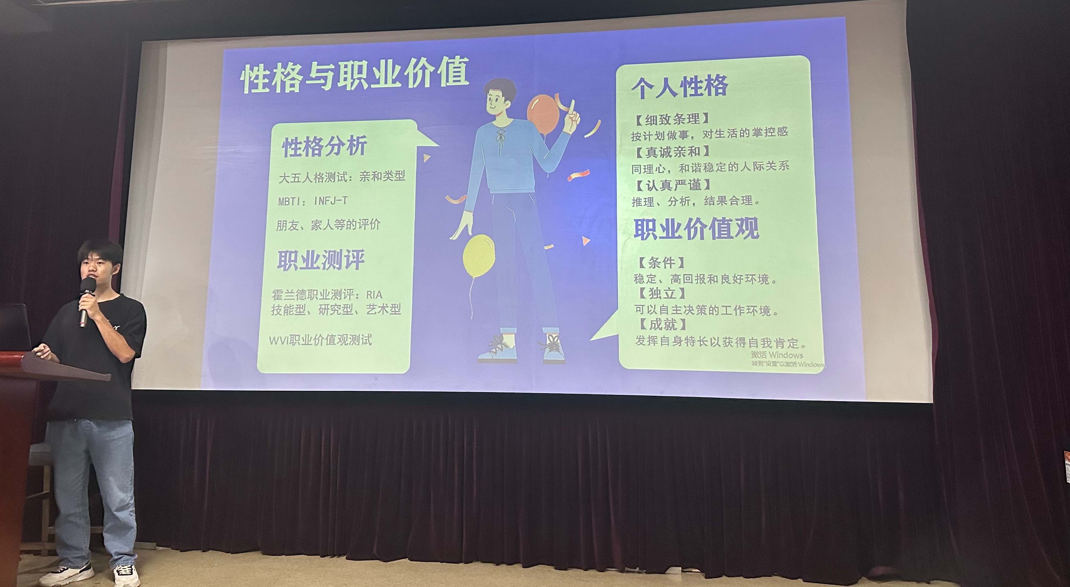 大赛经过前期“职业生涯人物访谈”与“职业生涯规划书”两个环节的评选,最终共12名同学进入汇报展示。汇报分为材料评选、现场PPT展示和评委提问三个部分。参赛选手就自己的自我认知、职业选择、规划路径等进行展示。