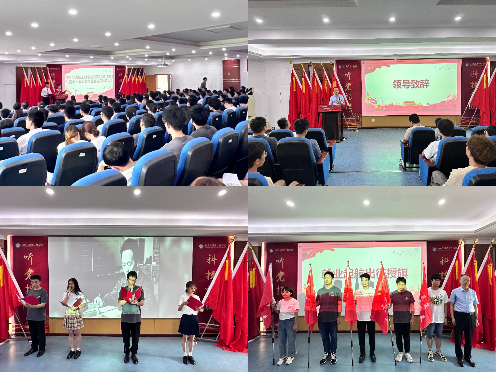 6月25日,学院党委召开2022-2023年度七一表彰暨毕业生党员教育大会,为毕业生上好“最后一堂党课”。学院党委书记冷甦鹏对即将毕业的党员同学提出三点希望:一是学思想,立信念,继续深入学习习近平新时代中国特色社会主义思想,勇做新时代的奋进者、开拓者、奉献者;二是建新功,筑梦想,发挥信息与通信工程学科的优势和特色,积极投身国防建设和国民经济生产;三是强党性,悟初心,胸怀国之大者,发挥党员模范带头作用,勇做改革创新的先锋人。毕业生党员代表带来原创红色诗歌朗诵《科技报国长征路》,冷甦鹏为赴西部、基层、部队、国防重点单位等工作的毕业生代表授旗,同学们依次分享自己扎根基层、献身国防的青春志向和不负青春、科技报国的坚定决心。