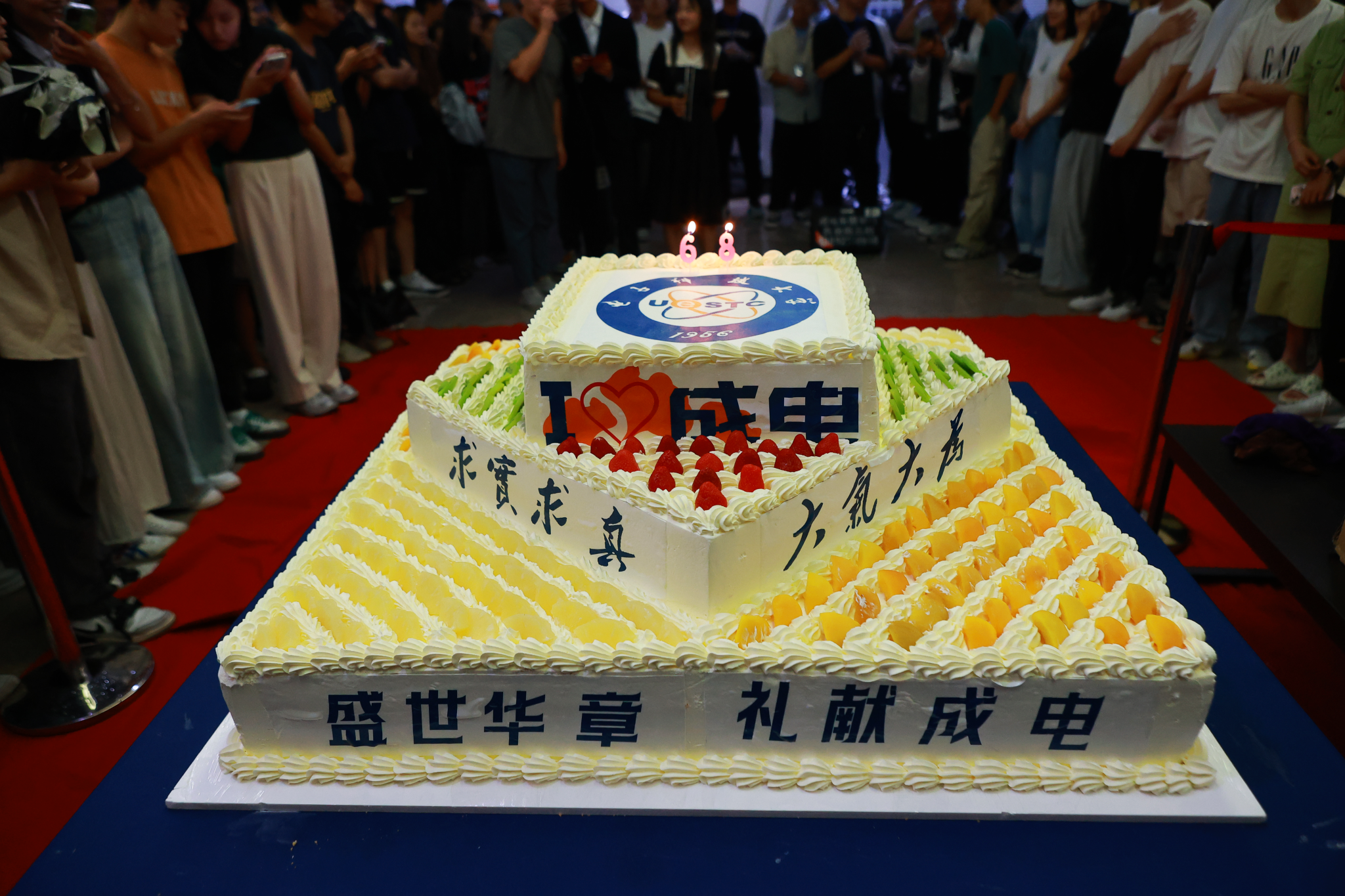 在主持人的带动下,学生会工作人员以温暖与热情点燃了现场气氛。随后,蛋糕宴活动正式开始,全场倒数五四三二一,在场师生齐声喊出“我爱成电,生日快乐!”的真情告白,为成电建校68周年献上真挚祝福。