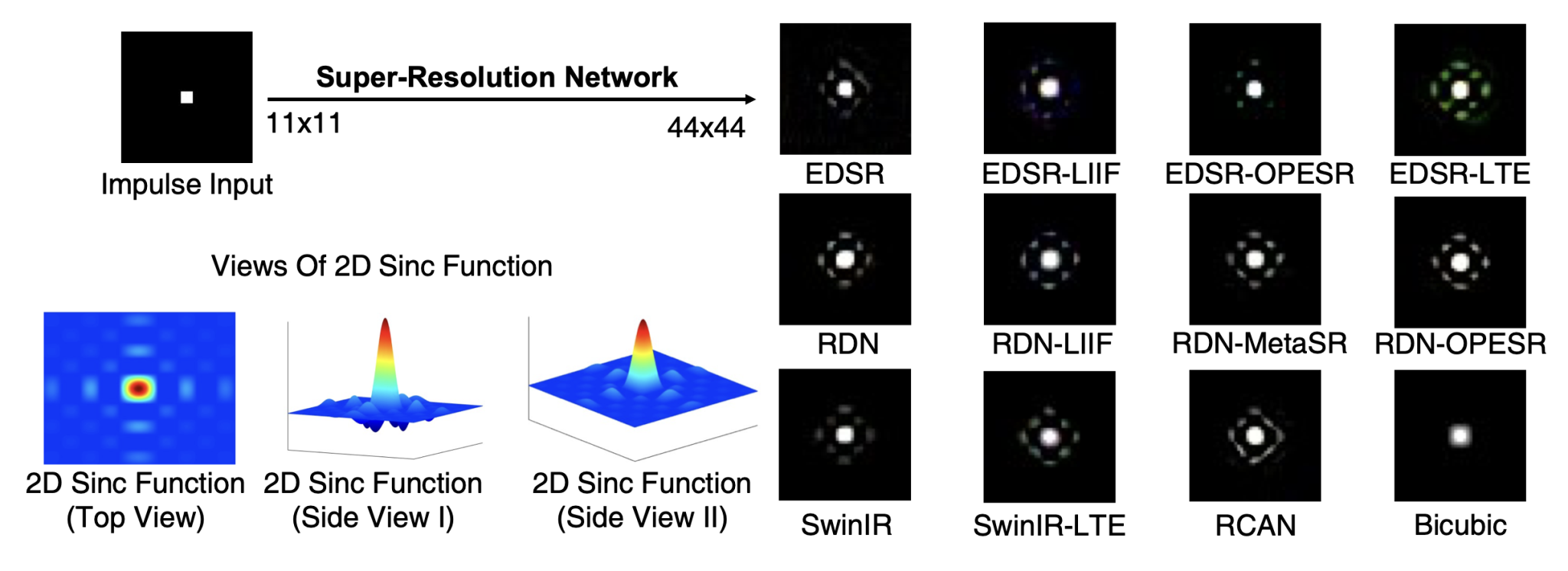 受到数字信号处理当中上采样器的原理启发,该文章对网络进行了冲激响应测试,发现用于图像超分任务的网络的冲激响应实际上是一个低通滤波器。图像超分辨任务本质上是一种信号上采样任务,在传统信号处理领域中,上采样已经是非常成熟的操作。一个上采样器的工作流程可以这样描述:先把采样过后的离散时间信号恢复成连续信号(函数),再用更高的采样率进行采样。而要将离散时间信号恢复成连续信号,只需要对其进行一个低通滤波。若我们对δ函数进行上采样,那最终得到的就是应该sinc函数。基于这样的想法,我们猜想神经网络内部也存在这样一个低通滤波器。该文章发现,若对图像超分辨网络输入一个只有一个像素为白色的图像,那么输出的图像花纹与sinc函数非常类似,即神经网络的冲激响应是一个sinc函数,如图2。