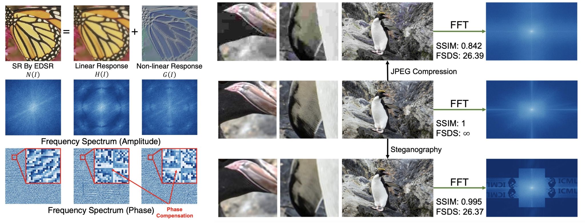 图3. 左:HyRA的线性系统和非线性系统的响应及其频谱。右:FSDS指标与主流SSIM指标的对比,SSIM指标不能很好地反应高频失真
