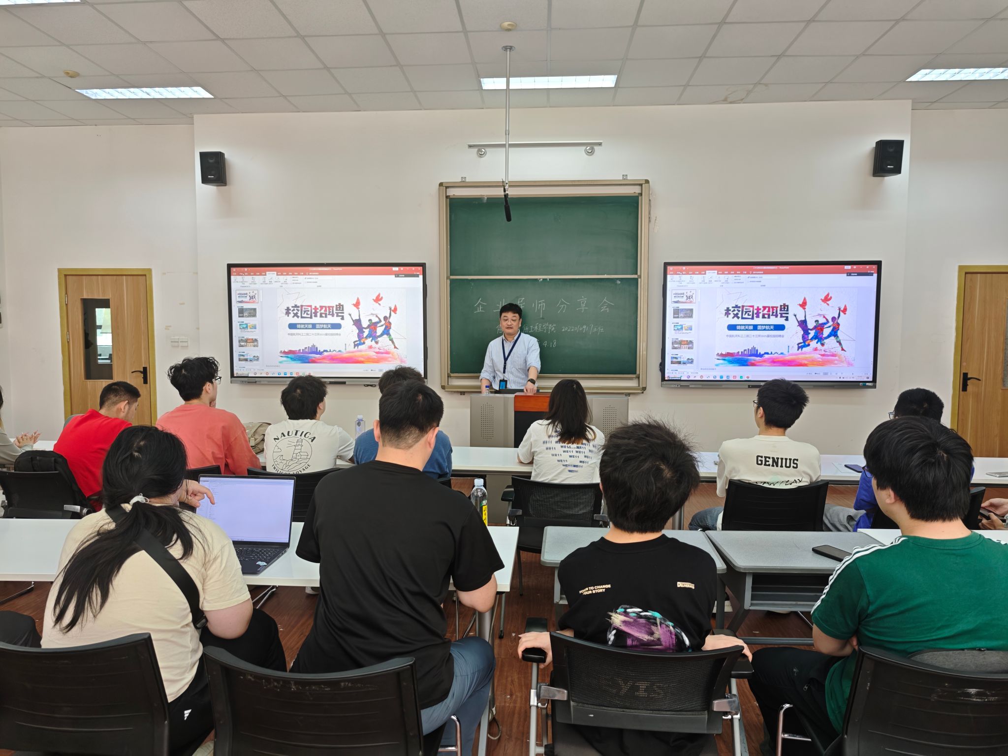 在交流分享环节,现场气氛热烈,同学们围绕职业发展规划踊跃提问。针对“如何科学选择考研专业方向”“如何将本科阶段所学知识有效转化为职场竞争力” 以及 “当前本科毕业生就业市场趋势分析” 等问题,杨岱旭老师结合自身丰富的从业经历,从学科适配度、企业用人标准等维度深入剖析。他不仅帮助同学们厘清学术深造与职业选择之间的辩证关系,还为大家提供了切实可行的能力转化路径建议。杨老师通俗易懂、深入浅出的解答,为在场同学在不同发展赛道上指明了努力方向,让大家对未来规划有了更清晰的认知。