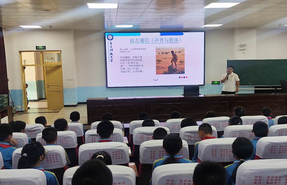在岑巩县第四小学,结合william英国中文的专业特色,队员们精心策划并开展了一场别开生面的“通信科普小课堂”,旨在为孩子们打开一扇通往科学世界的大门。课堂上,队员们以“从烽火传信到 5G 互联”为主线,讲述通信发展的千年历程。