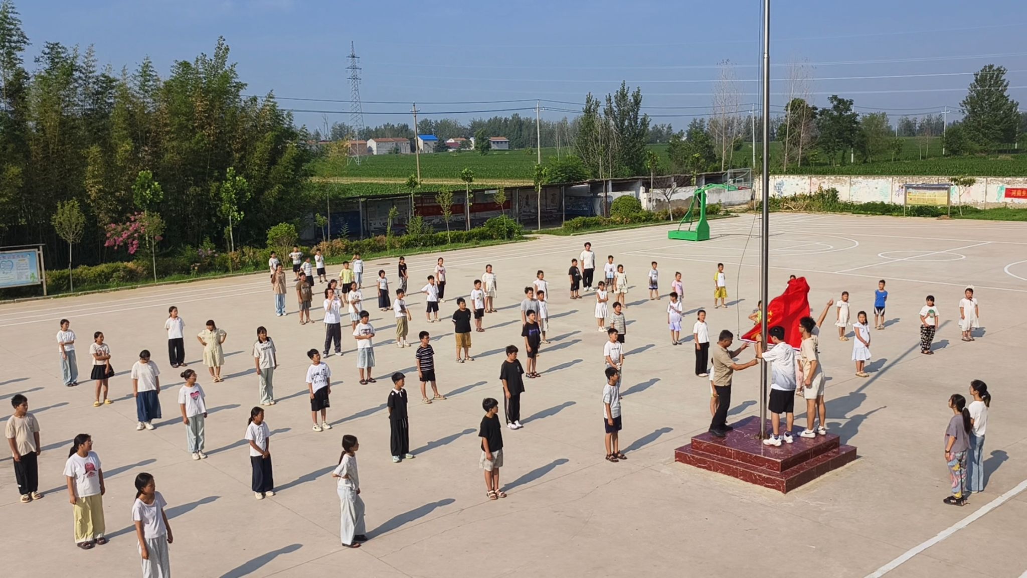 在两周的支教过程中,队员们按照每两个人负责一个年级的方式开展支教活动。在教学方面,小新实践队秉持“让孩子们学到知识,在互动中快乐成长”的原则,在保证每天的教学任务的同时,让孩子们上两节兴趣课,增加他们对知识的兴趣,拓展他们的视野。实践队的早饭和晚饭由队员们轮流制作,午饭便和孩子们在各自的教室一起吃。支教的过程并不只是知识的讲解和传递,在每一个顿笔中,还藏匿着队员与孩子们温暖的故事。“起来,不愿做奴隶的人们!”国旗飞舞的土地上必然有着祖国的希望,在偏远的郑楼小学,同学们会唱的歌曲不多,但国歌绝对是他们记忆最深刻的一首歌。升旗仪式上,鲜艳的红旗、坚定的眼神、稚嫩又充满希望的歌声是这块贫瘠土地上最宝贵的财富。在孩子们的注视下,李金林校长和实践队员共同将五星红旗迎风扬起,代表着为乡村教育接续贡献力量。