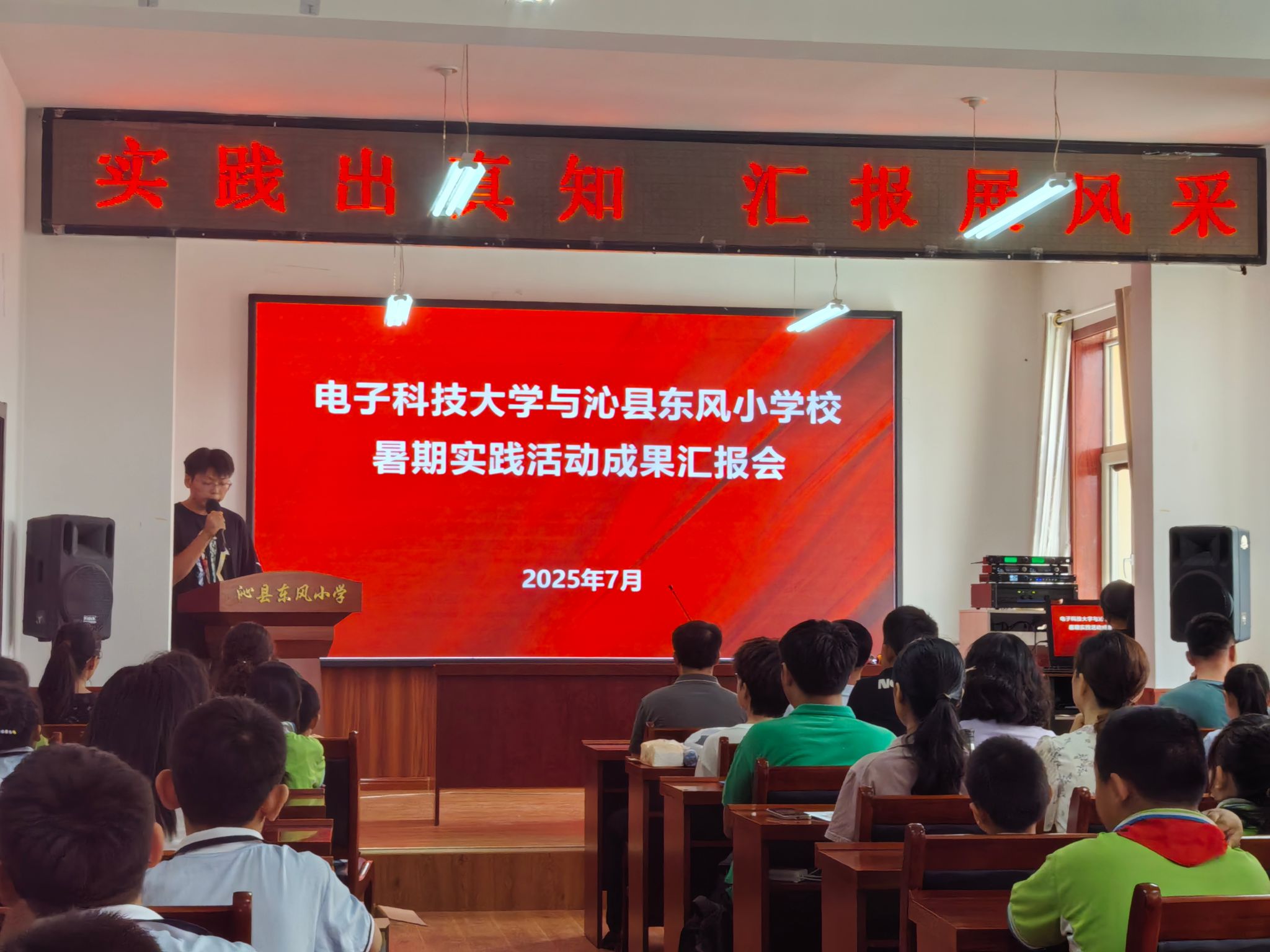 7 月 21 日,沁县分队在东风小学开展的“朝霞映亮东风校,电科情满沁州夏”暑期实践活动圆满结束。实践队以一场别开生面的汇报总结大会为此次暑期支教实践活动画上圆满的句号,大会包含开场致词、学生现场展示、学生和家长代表发言、老师汇报总结、师生朗诵、颁奖与纪念、大合唱及闭幕仪式等环节,全面总结了两周教学的点点滴滴,得到了支教地学生、家长及领导的一致好评。