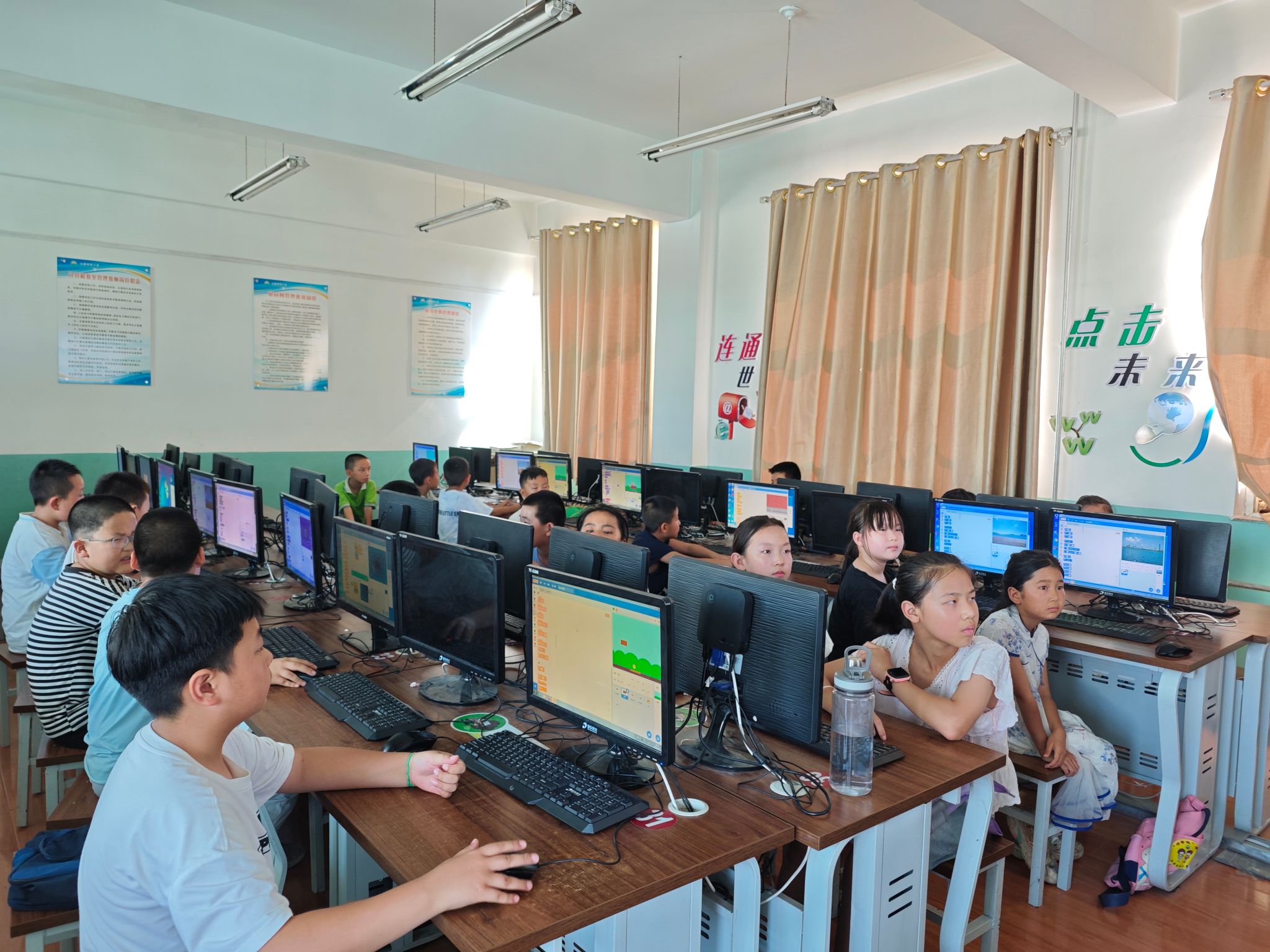 在系列课程中,计算机初步、物理小实验以及手工制作等,作为特色课程受到小朋友们的一致喜爱。计算机初步以 Scratch 软件为载体,秉持“兴趣为主、循序渐进”原则,通过趣味游戏激发学生兴趣。课程设计采用“递进式”方法:先认识软件界面与用法,用“小猫过马路”引入基础控制,用“躲避老虎”融入逻辑判断,用“龟兔赛跑”巩固所学,用“打砖块” 综合应用并教授“克隆”与“变量”。课程让小学生们初步了解了编程逻辑,提升了逻系统思维与创造力。