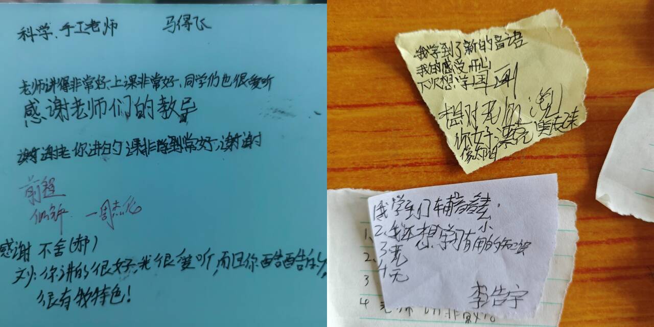 除了特色课程外,实践队还精心设计了日常管理和家校沟通机制,保障同学们的安全,并积极与家长、老师沟通调整教学内容和教学进度,以更好地适应学生需求,助力学生成长。黎城分队的队员们每天都会收集同学们反馈的小纸条,包括大家的课堂收获、兴趣点和意见建议等。每天的纸条都会被小老师汇总并发到群里,供队员们参考调整。通过反馈环节,师生之间保持及时良好的沟通,也促进了课程教学的更好开展。沁县分队在每班设置正副班主任负责接送学生,开班第一节课确定班委及小组,设置助教维持秩序、答疑、拍照,通过群相册进行收纳,记录支教点滴;每日整理课程内容发布在家长群,使家长们了解学生在校学习情况;发布学情调研问卷,根据反馈调整课程设置,以提升教学质量。