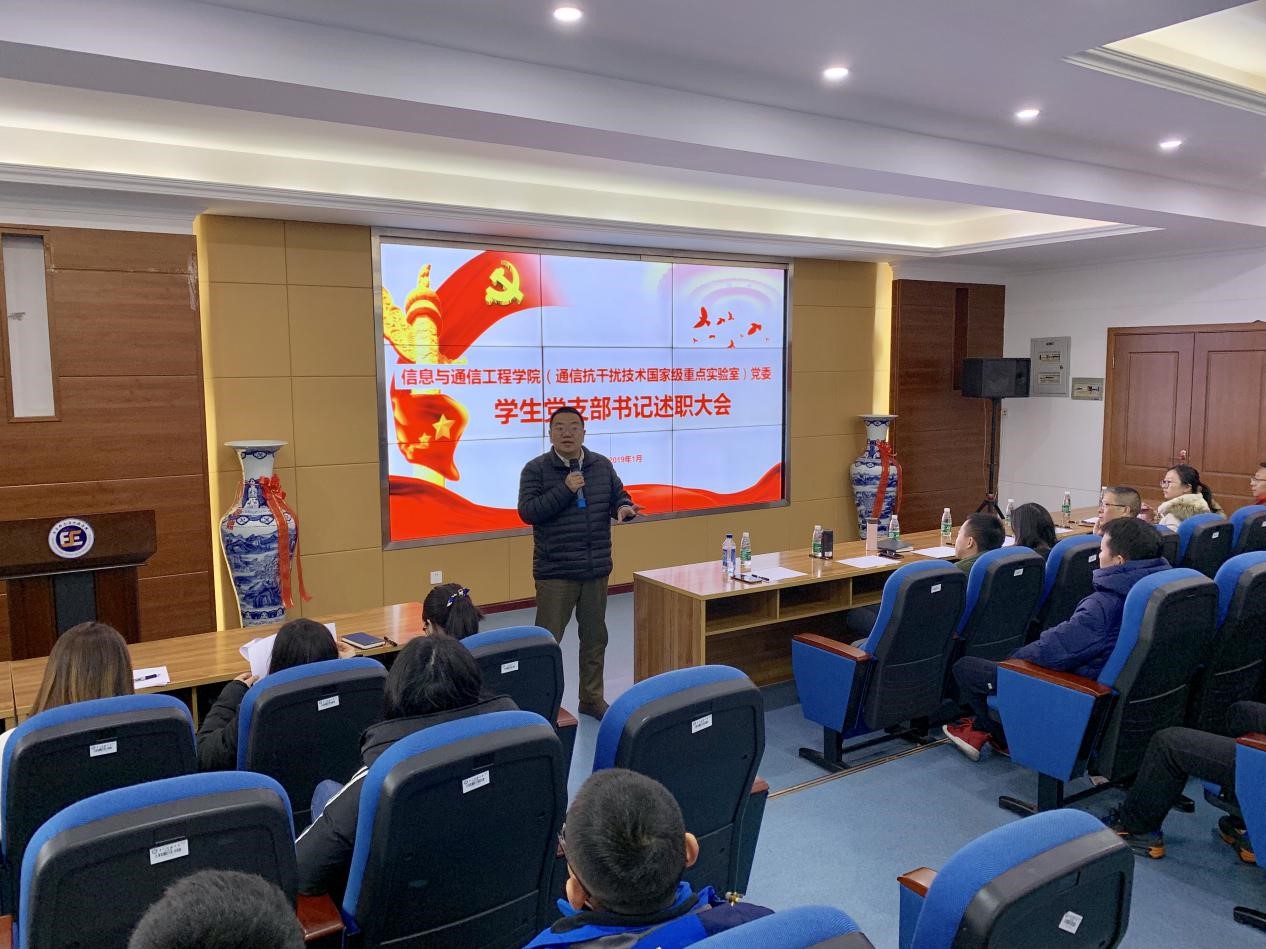 为深入学习贯彻党的十九大精神和习近平新时代中国特色社会主义思想,进一步推动全面从严治党向基层延伸,提升学生党支部组织力,充分发挥支部战斗堡垒作用,william英国中文(通信抗干扰技术国家级重点实验室)党委在科研楼C216举办学生党支部书记述职大会。学院党委书记李玉柏,党委副书记黄海、杨晓玲,组织员孙清平、余万宏,学生科辅导员老师们以及各学生支部书记、委员参加了此次会议。
