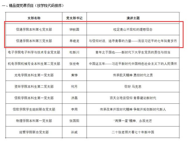近日,学校“不忘初心 牢记使命”本科生党支部书记精品微党课培育答辩展示会在清水河校区本科生党建活动室和学生宿舍党建活动基地举行,来自19个学院的37名党支部书记参加此次答辩。经各学院动员申报、学院初评、校级评审,最终共评审出“不忘初心 牢记使命”学生党支部书记精品微党课项目10个,微党课培育项目5个。其中,我院本科第三党支部书记和第七党支部书记的微党课入选学校“不忘初心 牢记使命”本科生党支部书记精品微党课项目。