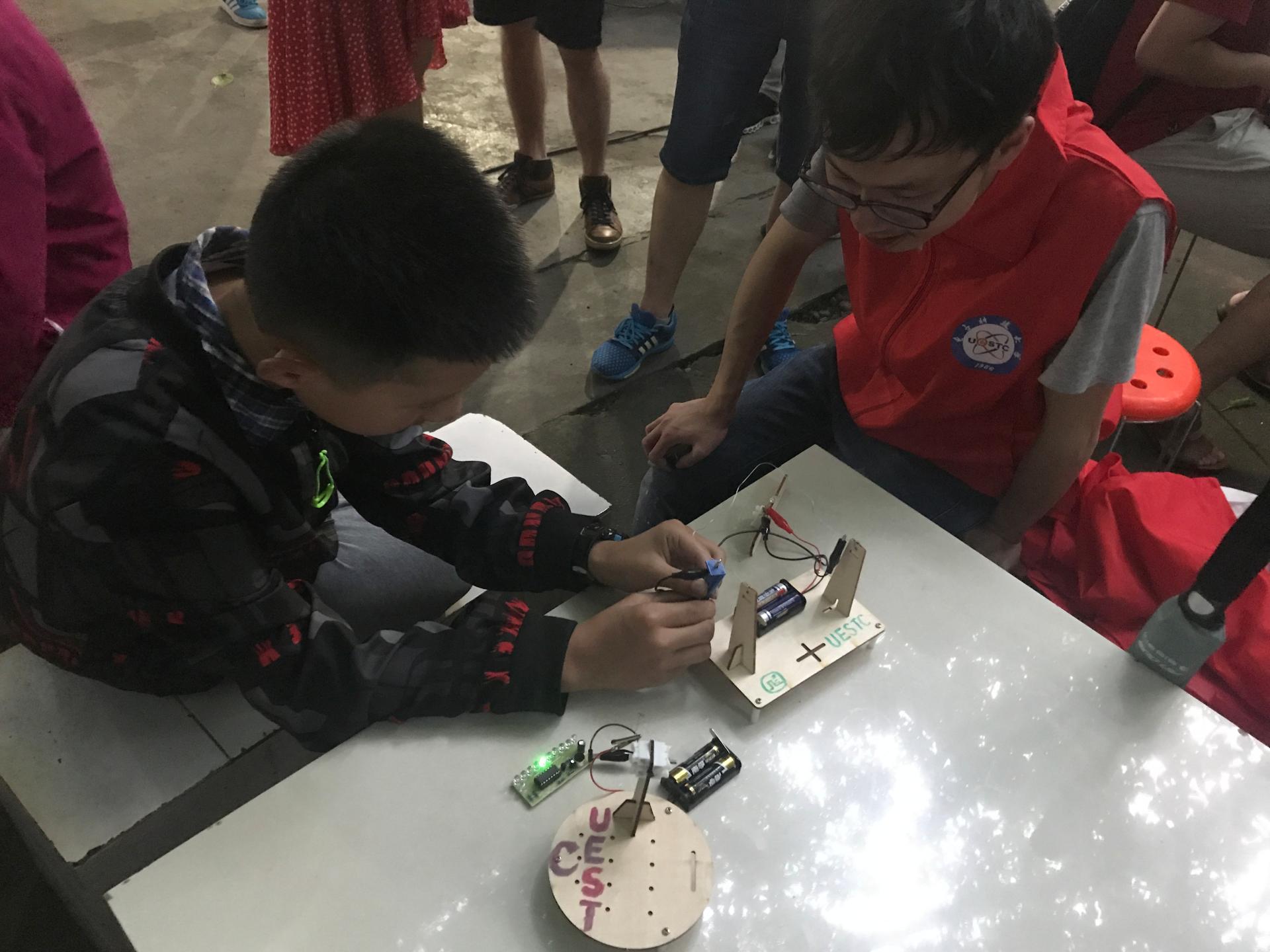 利用专业优势,科协同学携带DIY的电子小制作。小朋友可以根据自己的兴趣且在保证安全的情况下,安装不同的电路元件到不同的电路位置中,从而会产生不同的电路效果,激发小朋友对电路知识的兴趣。