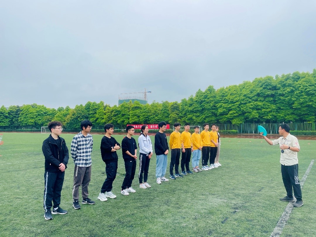 基础训练之后,正式进入飞盘竞技游戏。同学们根据着装颜色分为两队,首先进行的是飞盘投掷项目,双方选出最有默契的一对搭档进行限时投掷比拼,黑队在个人项目中暂时领先,而黄队在紧随其后的团队投掷中配合默契,紧接着扳回一城。