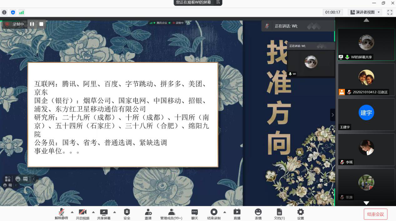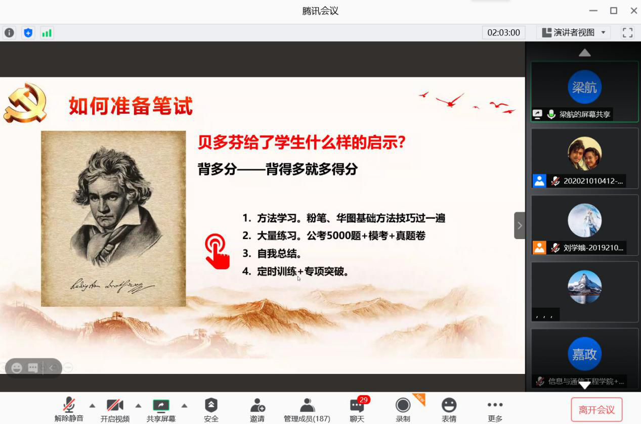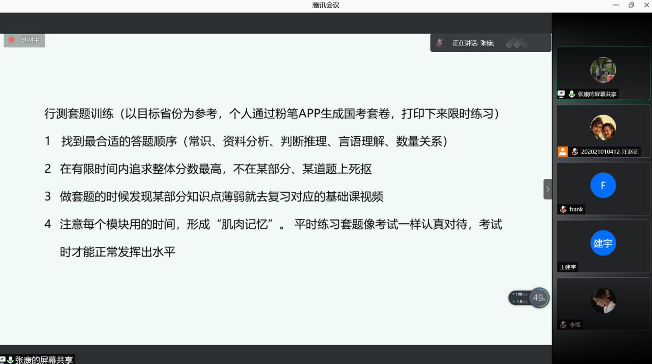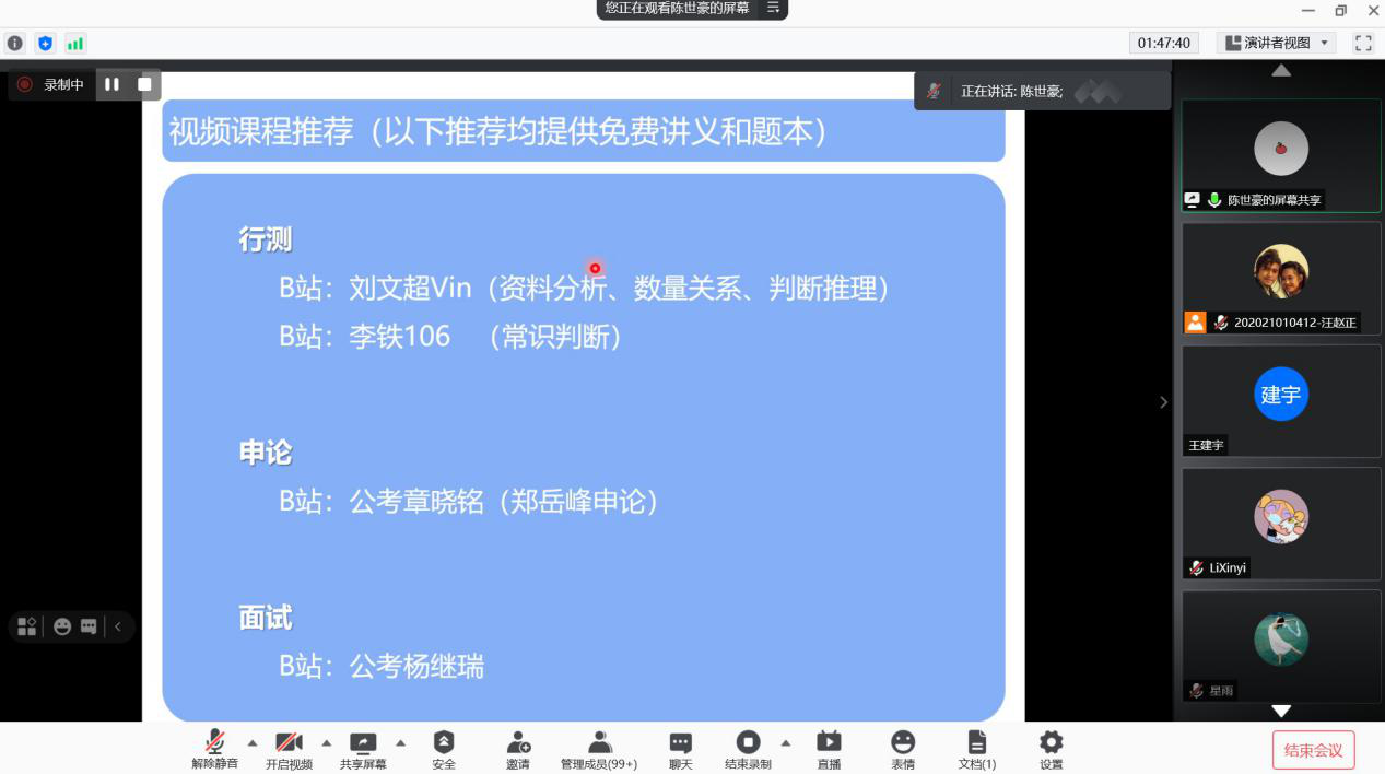 陈世豪师兄也通过一些题目实例给大家介绍了笔试的各类考试题型,并且向同学们推荐了申论行测等科目的相关视频课程,最后也分享了自己在备考过程中的一些做题策略等,让同学们收获良多。