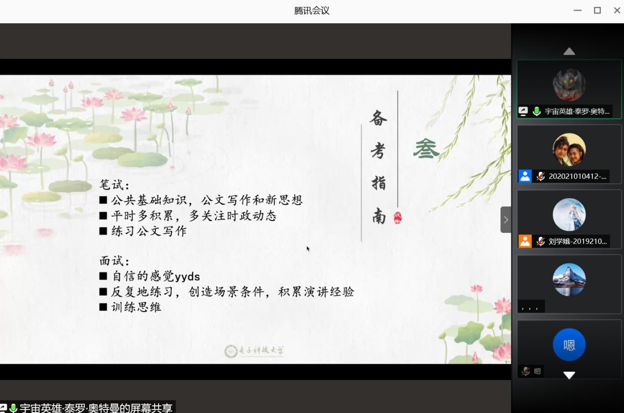 2021年4月22日晚、4月26日晚,信通学院研究生职业发展中心成功举办第四届“师兄师姐说”就业分享会——选调专场。本次分享会分为两场,总共邀请到9位优秀的师兄师姐,分别是中共德阳市委组织部的杨成浩师兄、自贡市委组织部的冯思源师兄、浙江省公安厅的蒋云超师兄、成都市委组织部的唐燕师姐、中共重庆市委组织部的梁航师兄、宜宾市委员会组织部的李瑶师姐、某中央部委的张康师兄、杭州市富阳区委组织部的陈世豪师兄、成都市委组织部的王丽师姐。分享内容主要包括选调生的介绍、信息获取、备考建议、笔试面试经验分享、求职心得分享等,共计吸引四百余名同学参加。
