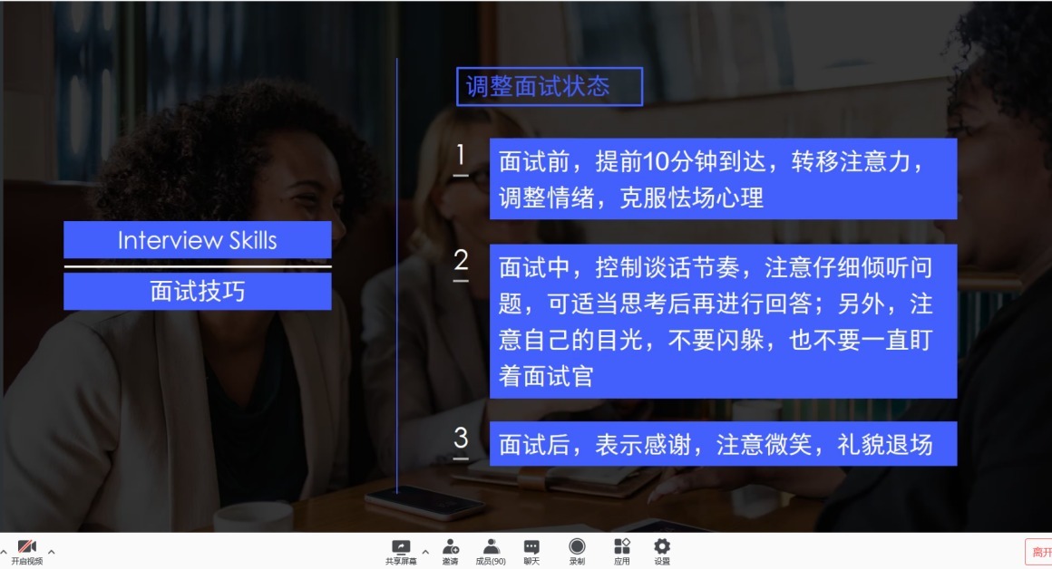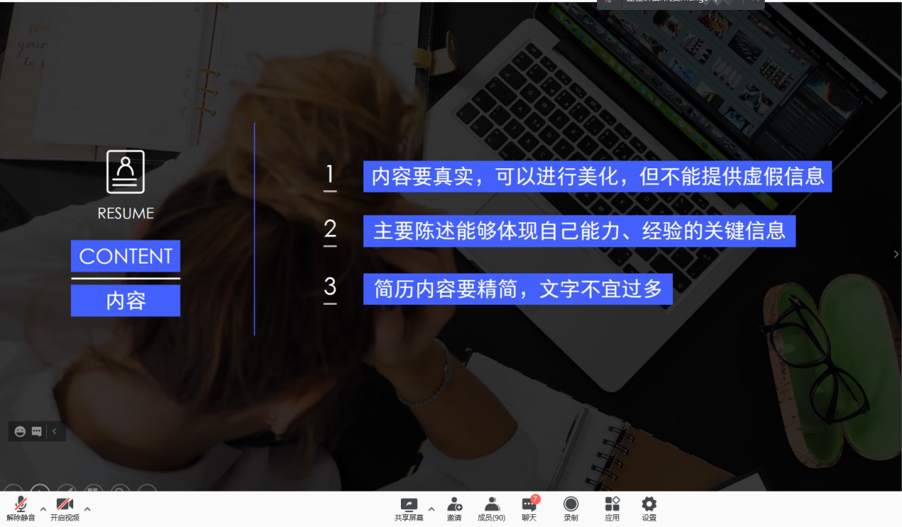 首先,周老师重点讲解了求职过程中的简历制作、面试注意事项。她指出简历制作需要注意格式,颜色不能过多过重,背景不要太复杂;内容上应从简,客观而真实,着重突出个人能力、经验等关键信息。针对面试,周老师则从面试考察能力和面试误区角度,告诉同学们在面试时应控制谈话节奏,注意力集中,把握眼神交流的度以及注重面试基本礼仪。