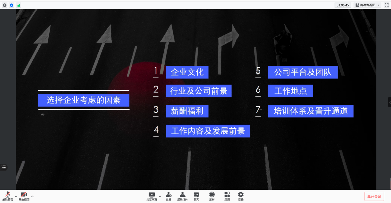 分享会上,周曼老师围绕“如何获得一份好工作”“众多offer的选择”和“公司的人才观”等同学们较为关注的问题进行交流、指导。