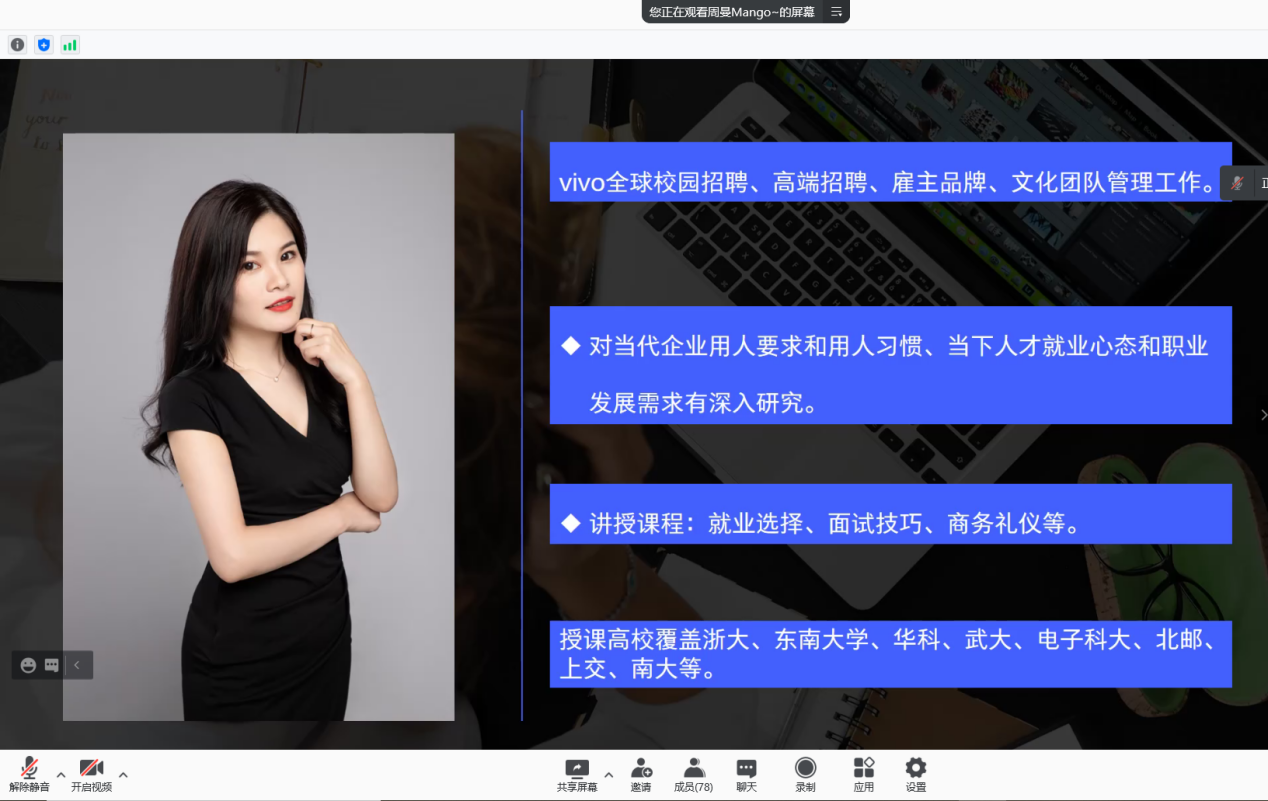 2021年11月4号,william英国中文研究生职业发展中心成功举办“HR面对面”之vivo专场线上活动。此次活动特邀vivo全球校园招聘与雇主品牌总负责人周曼老师为同学们分享优秀企业的求职经验,帮助同学们掌握求职技巧,认清就业形式、做好职业规划。
