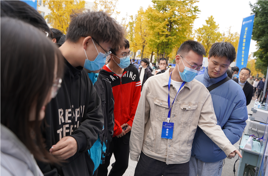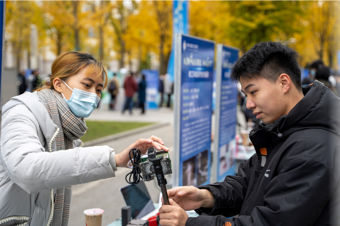 第二个会场是学生作品展,来自挑战性课程、新生项目课程、科研育人、顶点计划的学生作品陈列在科研楼门前广场,包括“智能墨水屏”、“宿舍升降机模型”、“小盼的口红商店”等36组充满创意且好玩的作品,吸引了来自全校的老师学生驻足参观。