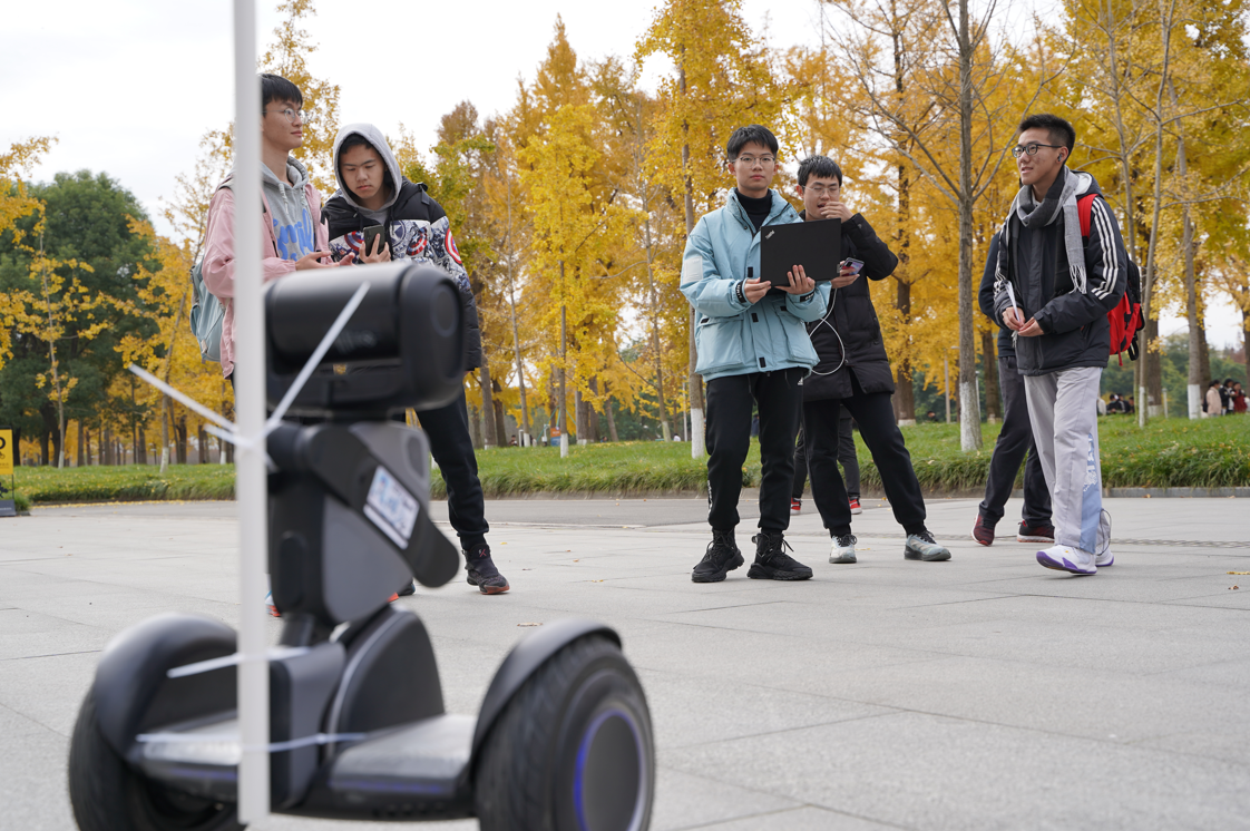 本次作品展分为两个会场,一是在立人楼门前广场举办的“智能机器人道路争先赛”,30名一年级新生分成六组以竞速的形式参加新生项目课《基于深度学习的视觉感知与智能机器人》的课程期末考核,竞速比赛赢得现场阵阵掌声。