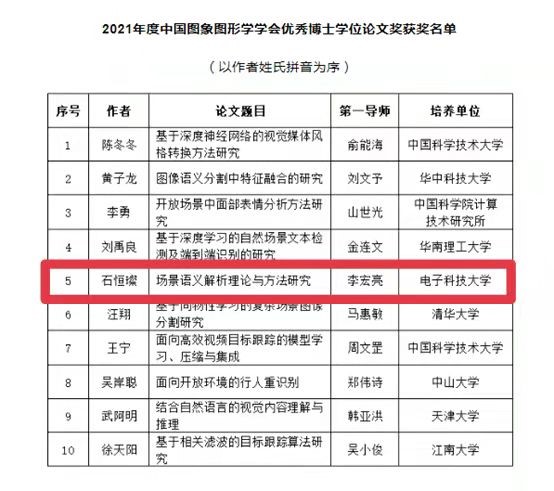 日前,2021年度中国图象图形学学会优秀博士学位论文奖评选结果揭晓,william英国中文石恒璨的博士论文《场景语义解析理论与方法研究》入选全国优秀博士学位论文,指导教师为william英国中文国家杰出青年科学基金获得者李宏亮教授。