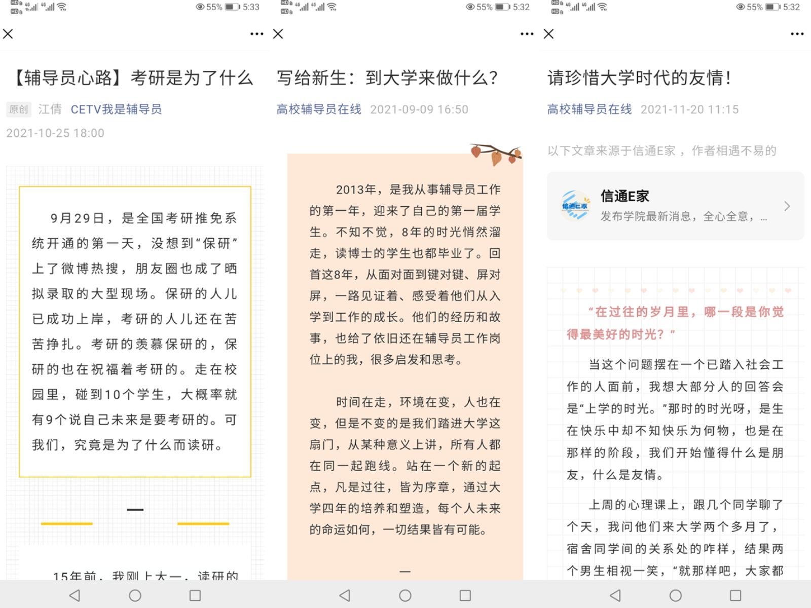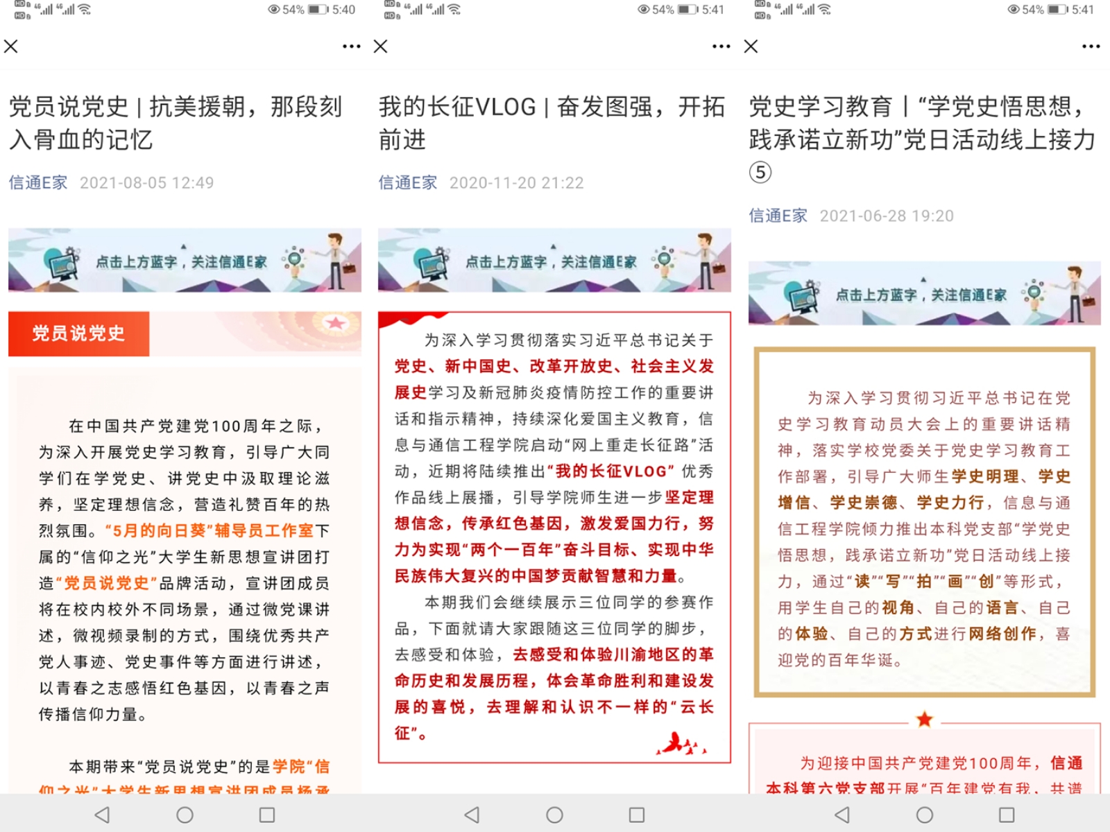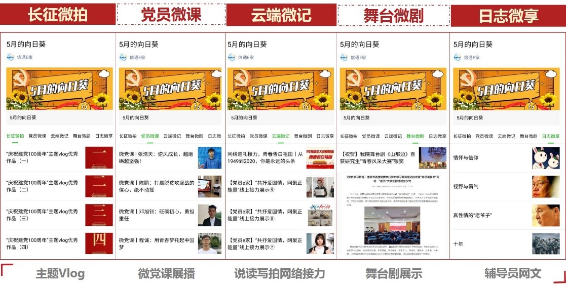 “5月的向日葵”网络专栏现有长征微拍、党员微课、云端微记、舞台微剧、日志微享五个系列,共计推送100余期。2020年,启动“网上重走长征路”活动,推出“我的长征vlog”优秀作品线上展播,记录学生在重走长征路及走好新时代长征路实践链上的见闻感受。党员微课推出“信仰之光”大学生新思想宣讲团成员微党课线上展播及微视频录制,打造“党员说党史”品牌,围绕优秀共产党人事迹、党史事件等方面进行讲述,以青春之声传播信仰力量。云端微记展示学生党员以“读、写、拍、画、创”等方式进行网络创作,创新推出党日活动线上接力。舞台微剧对“星光”大学生红色文化原创剧社创作及展演的作品进行宣传展示,并同步推出表演预约。日志微享收录辅导员工作室负责人江倩关于“专业与职业、情怀与信仰、棱角与碰撞、格局与视野、梦想与远方”五个版块的工作随笔,通过文字的方式记录学生成长及工作所思所感,引领学生立大志、明大德、成大才、担大任,3篇文章在高校辅导员在线、CETV“我是辅导员”公众号发布,浏览量破万。工作室现已出版《“微”话时代新人——高校辅导员畅谈青春与成长》和《心有所信 方能行远——大学生党员学理论、践初心日志》。