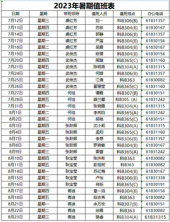 暑假期间,院领导带班、机关各科室轮流值班。具体值班安排及要求如下