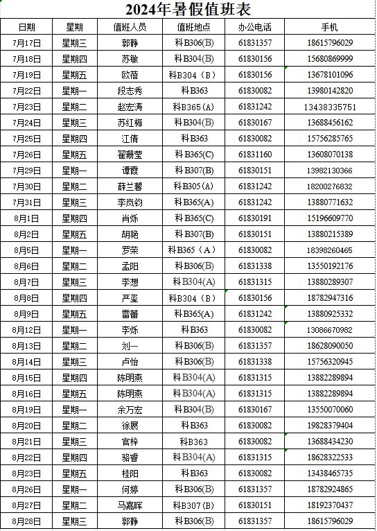 暑假期间,院领导带班、机关各科室轮流值班。具体值班安排及要求如下