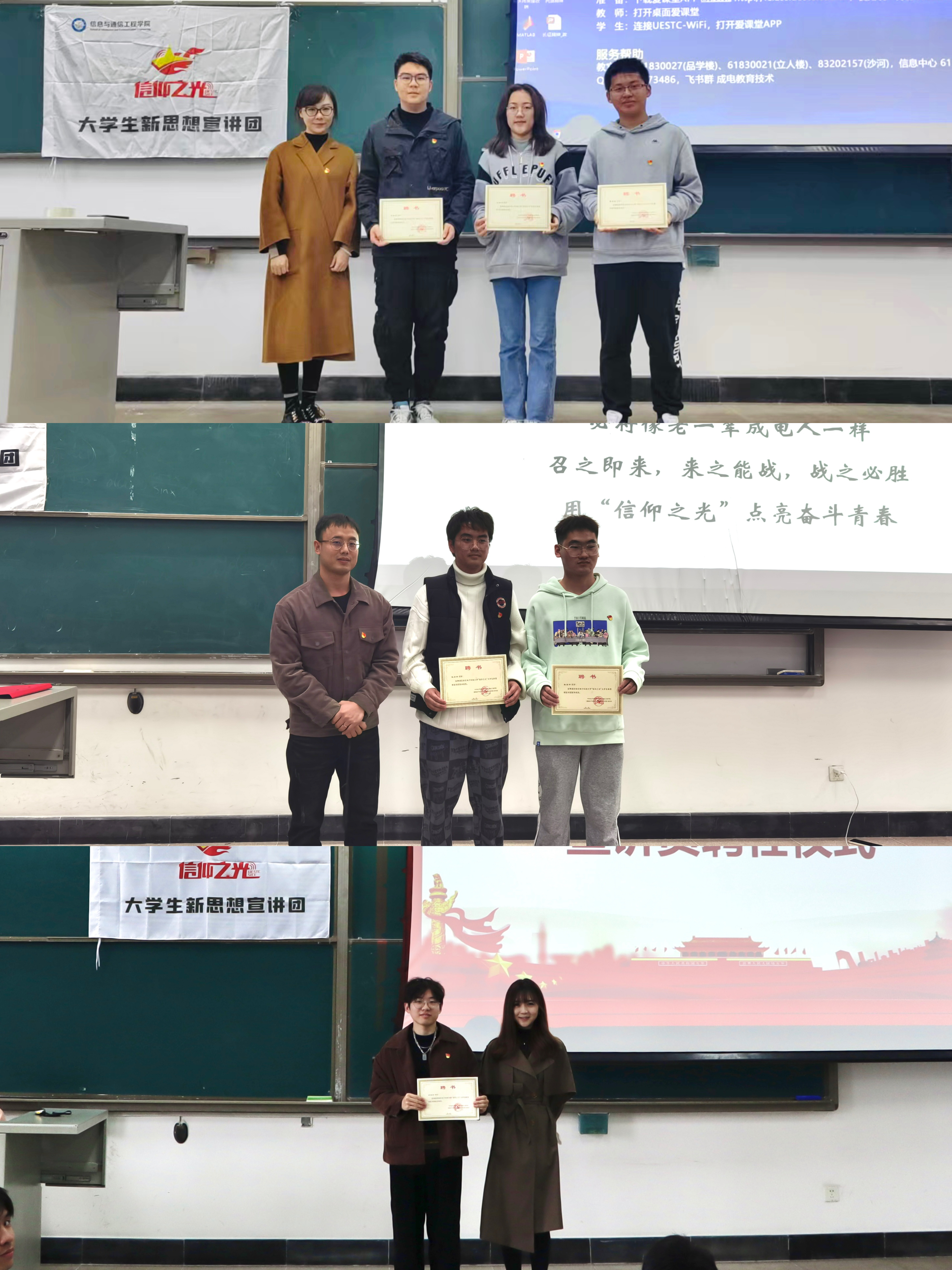 随后,宣讲团12名成员结合党的二十大精神,从成电建校史、学院发展史、中国共产党人的精神谱系、时政热点解读四个方向出发,围绕共读二十大、新青年的使命、两路精神、新时代北斗精神等12个主题,声情并茂地为党校培训班学员们带来微党课宣讲。指导老师依次进行总结点评。