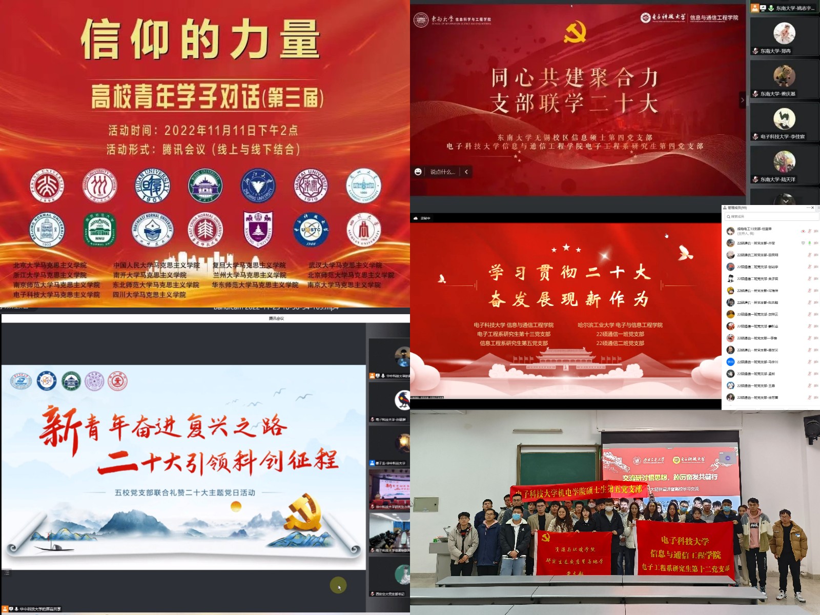 物联网工程系研究生第三党支部先后与计算机科学与工程学院(网络空间安全学院)党委3个研究生党支部、智慧物联教工党支部举办“学习二十大,奋进新征程”联合党日活动。中共四川省委党校(行政学院)区域经济教研部副主任贾舒教授、计算机学院党委副书记李青、成都中医药大学附属医院医联体管理中心主任张娜和智慧物联教工党支部书记文光俊结合自身岗位,以不同视角解读二十大报告内容,激励同学们为实现中国式现代化勇毅前行;全国高校优秀思想政治理论课名师罗大明教授为师生党员作“科教兴国战略、人才强国战略、创新驱动战略”专题报告。