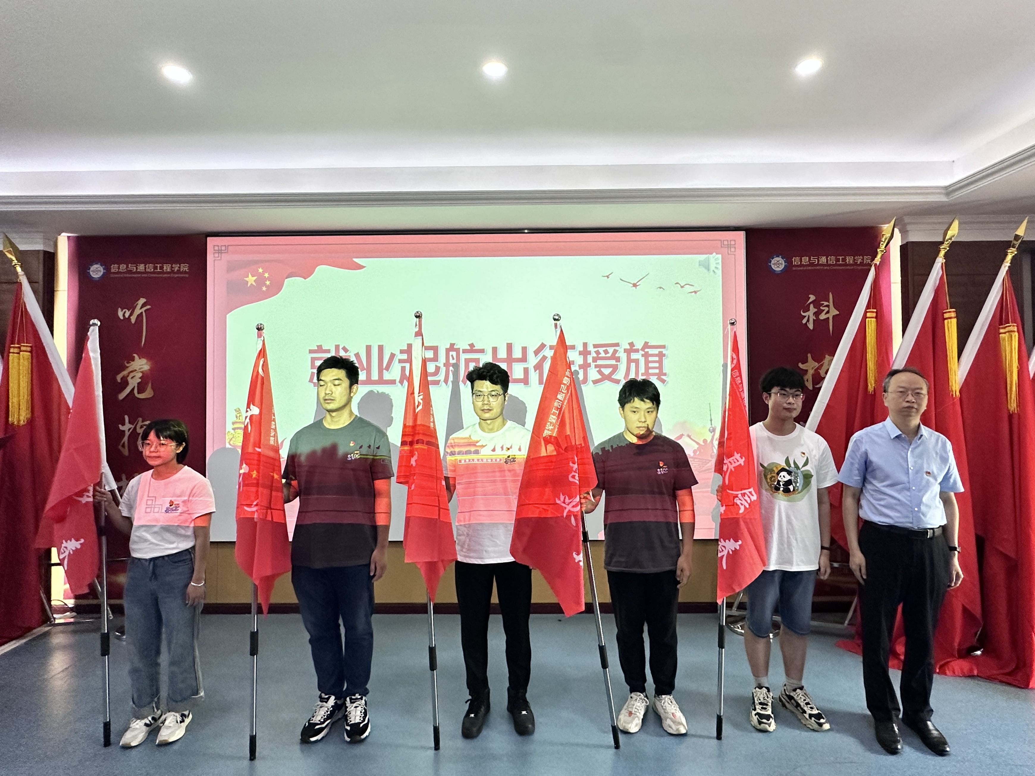 接着,进行毕业生就业起航出征授旗仪式,冷甦鹏为赴西部、基层、部队、国防重点单位等工作的毕业生代表授旗。同学们依次分享了自己扎根基层、献身国防的青春志向和不负青春、科技报国的坚定决心,同时表达了对学院培养的感激之情。