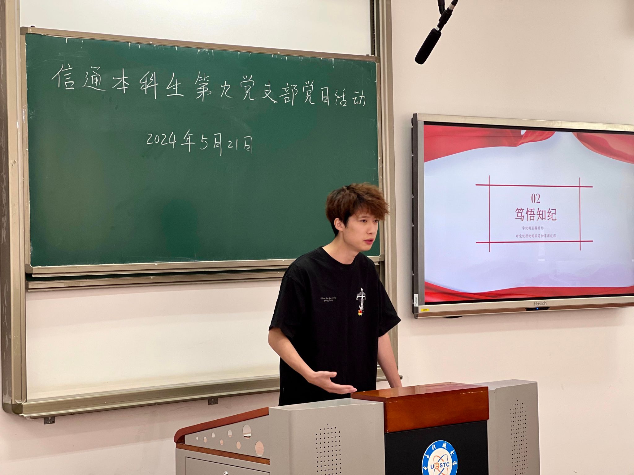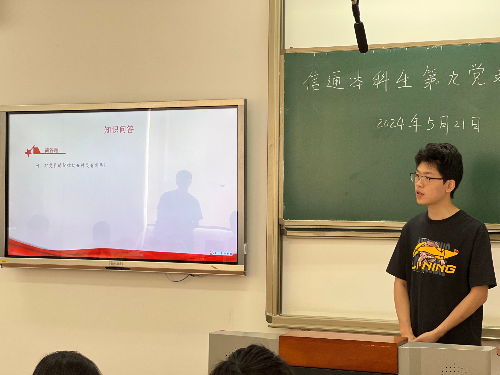 5月21日,学院本科生第九党支部在品学楼C区113开展了党纪学习教育主题党日活动,全体党员围绕“学纪”“知纪”“明纪”“守纪”四个方面对《中国共产党纪律处分条例》进行深入学习。本次党日活动由第九党支部的沈浩然同志和李喆同志进行主持宣讲。