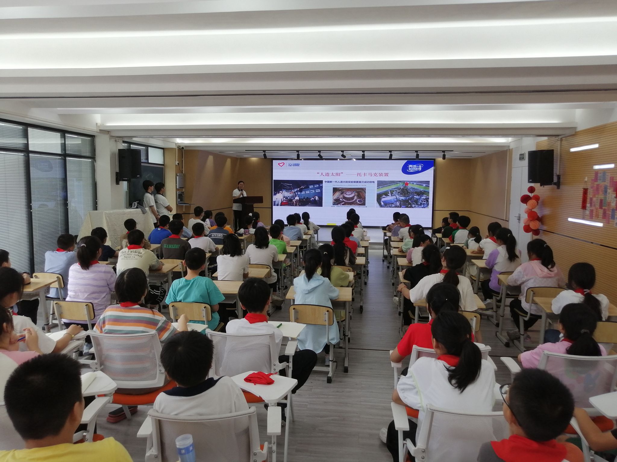 郝晟博以“回望两弹一星,共言报国之志”为题展开宣讲。他以“什么是两弹一星”发问,激发起小学生们的参与热情,通过讲述老一辈科技工作者攻坚克难、赤诚报国的英勇事迹,回顾了我国核事业发展初期的艰辛历程。他讲述了于敏毅然放弃理论物理研究投身氢弹研制、邓稼先不顾个人安危查找事故原因的感人故事,赞扬“两弹一星”功勋们干惊天动地事、做隐姓埋名人的伟大奉献精神,引导鼓楼小学的同学们弘扬爱国主义精神,争做新时代好少年。