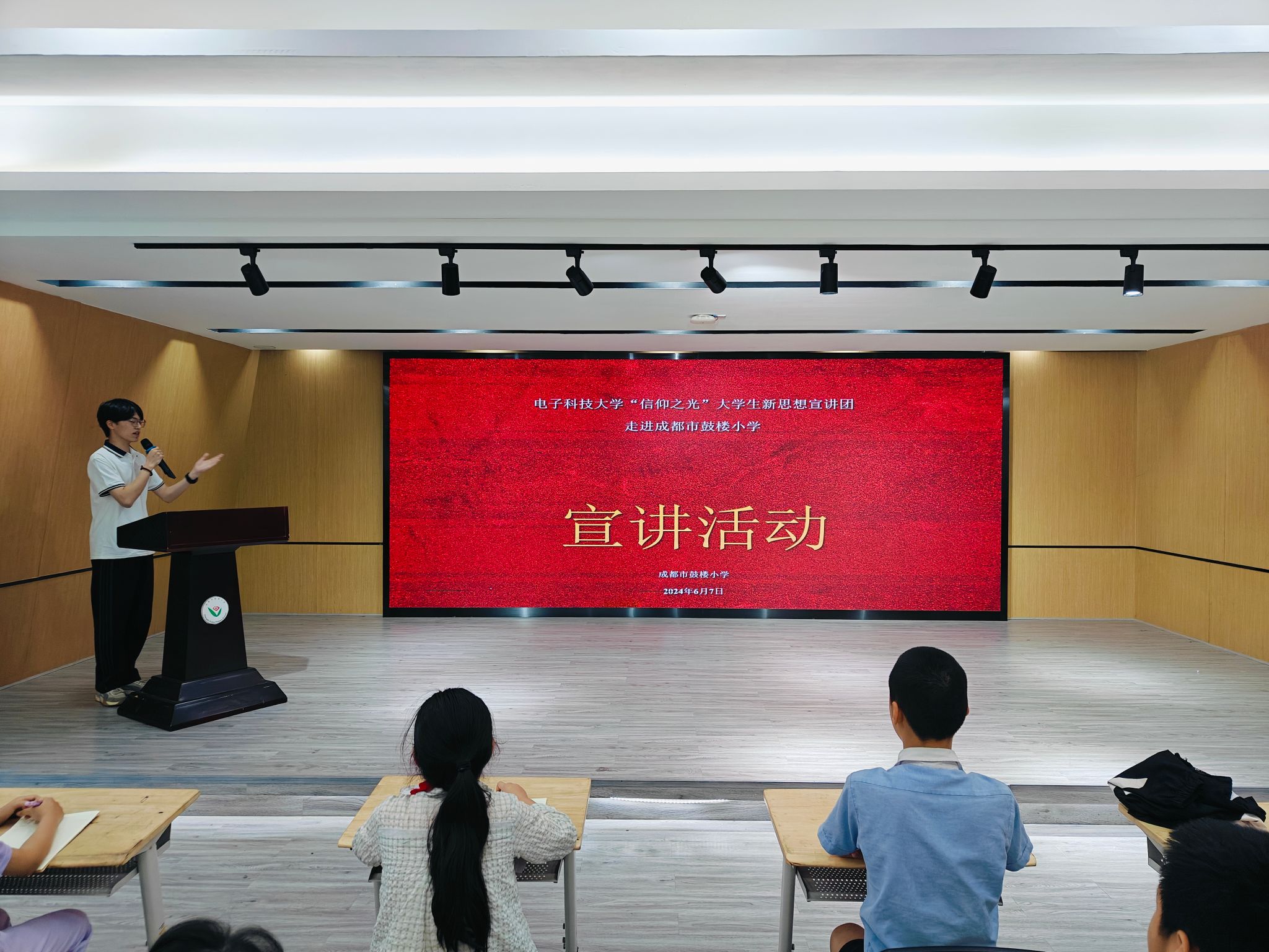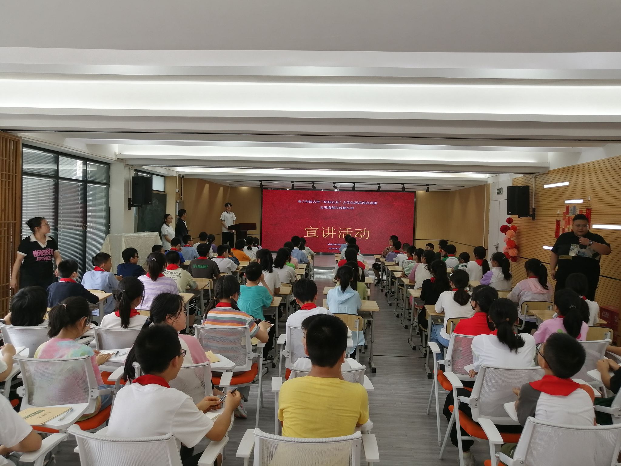 6月7日,“信仰之光”大学生新思想宣讲团前往成都市鼓楼小学,开展走进成都市中小学的理论宣讲活动,弘扬学院“听党指挥 科技报国”的学科文化和精神。信通学院学生科科长江倩、成都市鼓楼小学少先队辅导员夏寿鑫等出席活动,鼓楼小学80余名小学生参加,宣讲团成员来自本科生第九党支部