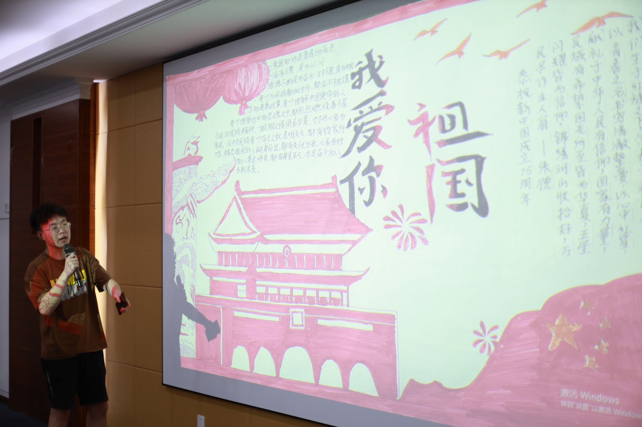 随后进行手抄报展示,各小组发言人结合各自手抄报的特点,不仅表达了对新中国的赞美,也抒发了对中国共产党的崇敬。他们或以长城为笔,书写中国75年的筚路蓝缕,或借锦鲤雄鹰,表达新中国的强大,或融入学院特色,把“听党指挥 科技报国”的理念嵌入其中。同时借麦穗,天安门城楼,镰刀斧头等一系列意象,表达了同学们对新中国以及中国共产党光辉历程的深刻理解。