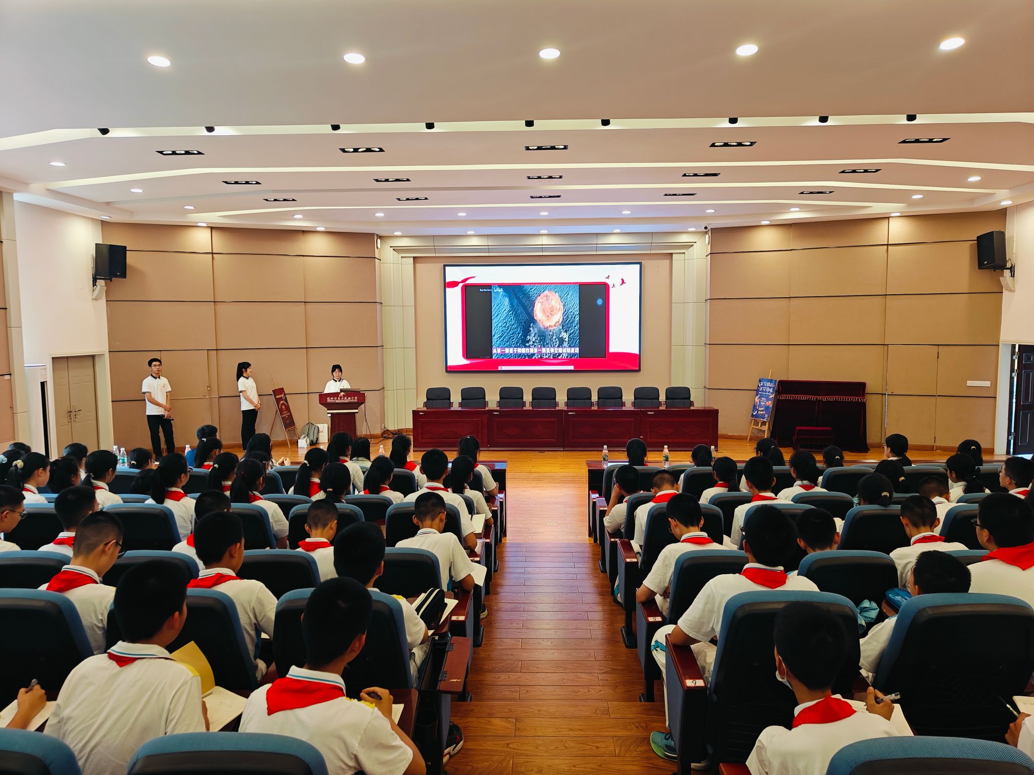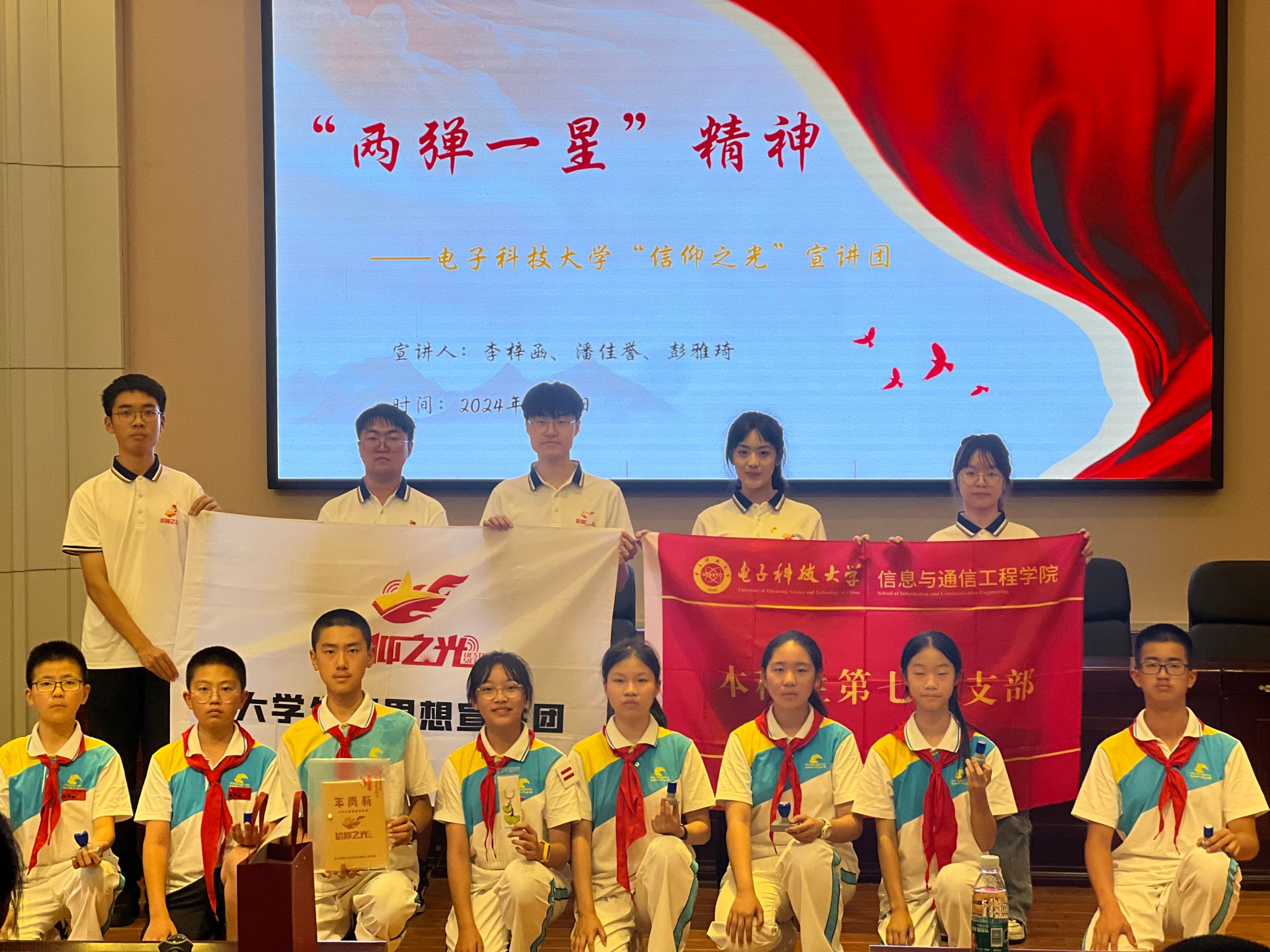 6月4日,信通学院“信仰之光”大学生新思想宣讲团开启走进成都市中小学宣讲活动第二场,3名成员前往成都市青羊实验中学,为100余名初中生开展“两弹一星”精神主题宣讲,传承弘扬学院“听党指挥 科技报国”的学科文化和精神。