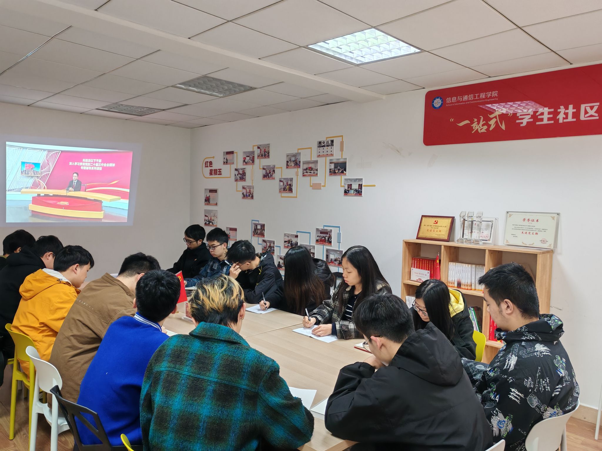 11月22日,信通学院本科生第五党支部在学院“一站式”学生社区“家”门口的领航驿站开展主题党日活动,集中学习党的二十届三中全会精神。