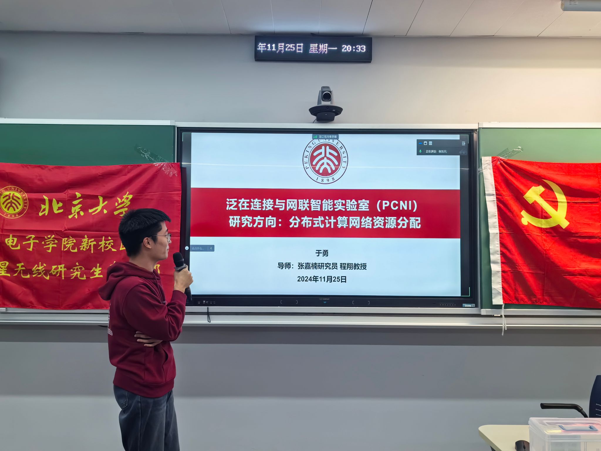 随后,北京大学电子学院的4位研究生党员进行分享。张天柱梳理了关于卫星通信、无线网络和光通信技术领域的最新研究动向,鼓励大家多进行科研尝试。文韦博、于勇结合实验室重大课题与重点项目,向本科生党员介绍了未来可选择的主要研究方向。武晨宇结合自身经历,向大家分享了专业知识学习经验和科研入门训练的建议。七支部党员们还就学科竞赛、论文撰写和求学深造等问题与研究生同学进行了请教学习。