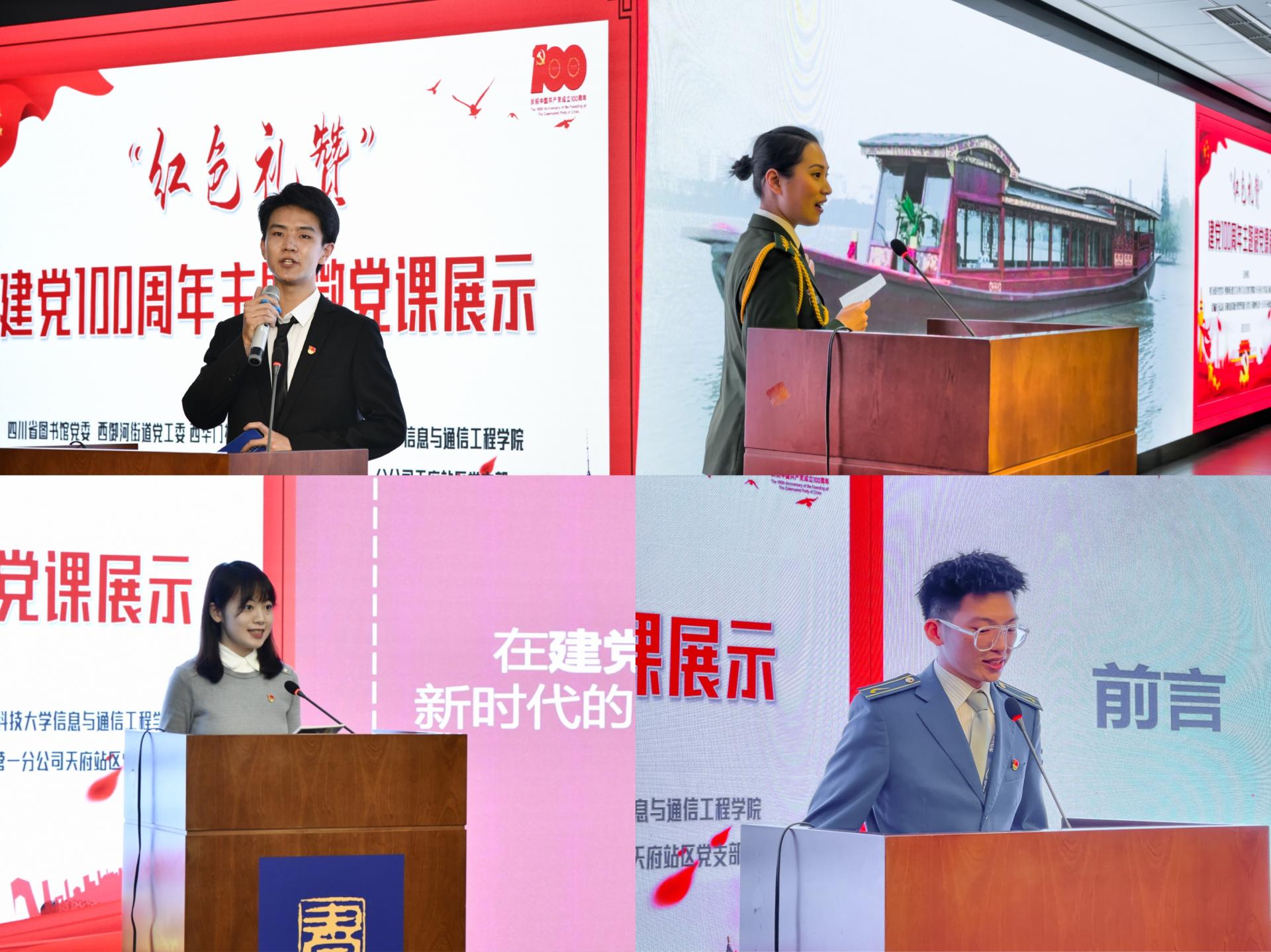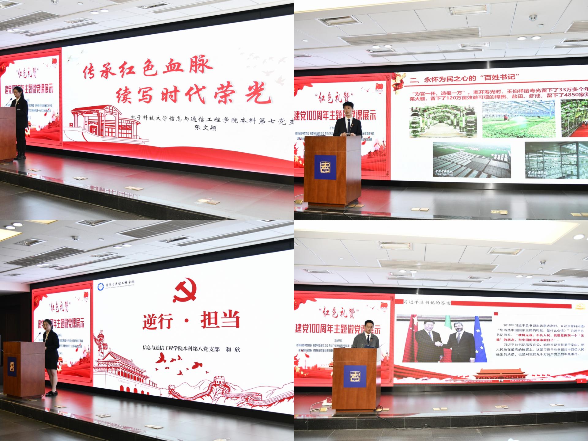 开场致辞后,“红色礼赞”建党100周年主题微党课展示正式启幕。“正是有了他们保家卫国,才能有我们今天的幸福生活,这些历史的印记,会随着时间的流逝愈发清晰珍贵……”当天下午,由我校“5月的向日葵”辅导员工作下属的“信仰之光”大学生新思想宣讲团的成员与各单位共计15名青年党员,围绕科技报国、中国外交、交通强国、成电建校史、红船精神等主题,通过文字、图片、短视频、漫画等形式,讲述了动人的党史故事,展现了共产党风雨兼程100年的伟大成就。他们结合自身经历和感悟,通过独特的视角,以小故事诠释大情怀,或激情澎湃,或娓娓道来,为在场评委和观众呈现出精彩纷呈的微党课展示。