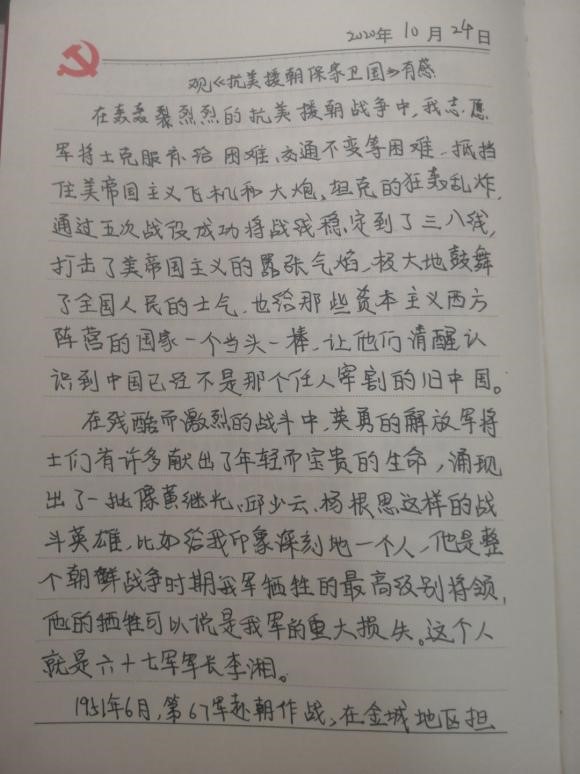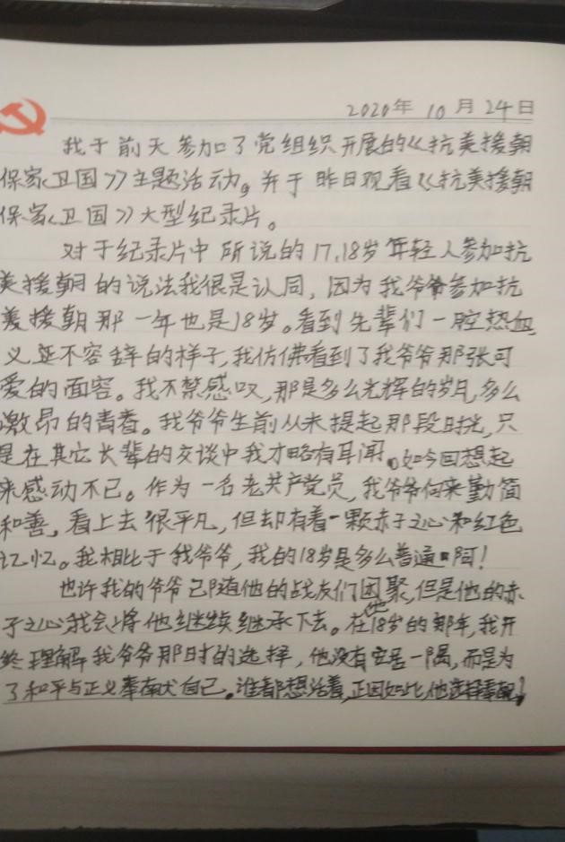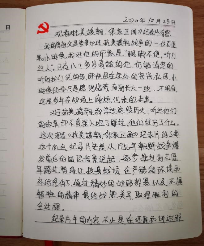 纪录片观看完毕后,党员同学们积极地以手写笔记的方式记录下自己的学习心得。以下是党员心得感悟。