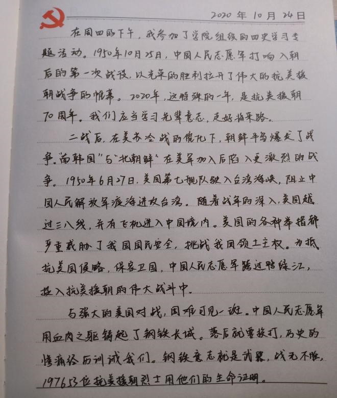 为纪念中国人民志愿军抗美援朝出国作战70周年,深入学习“四史”,响应习近平总书记的重要讲话,培养党员同志的爱国情怀,学习革命先辈不畏强暴、奋勇向前的精神,学院本科第六党支部开展并启动“深入学习四史,坚守爱国初心--21天理论学习”主题党日活动。