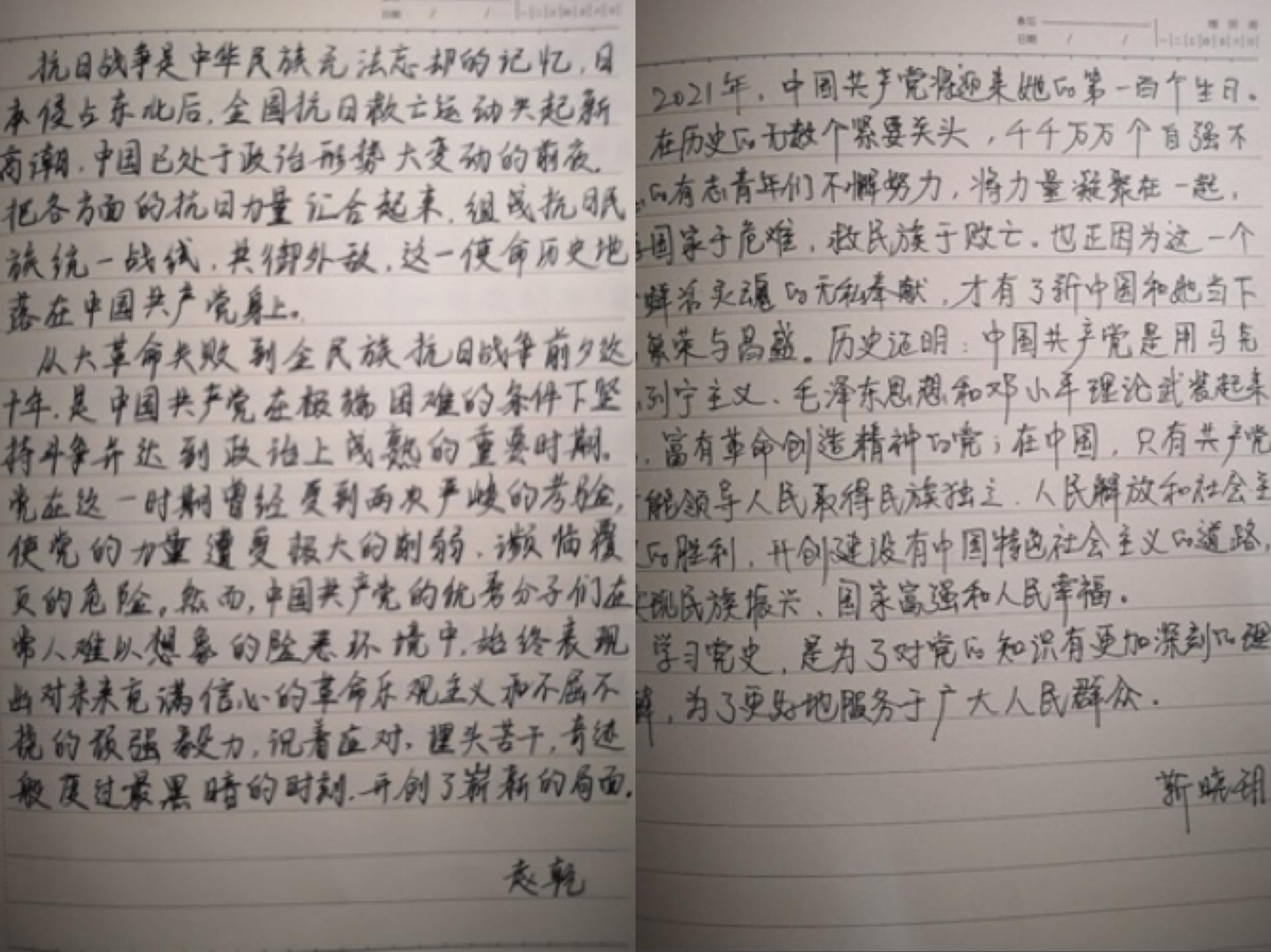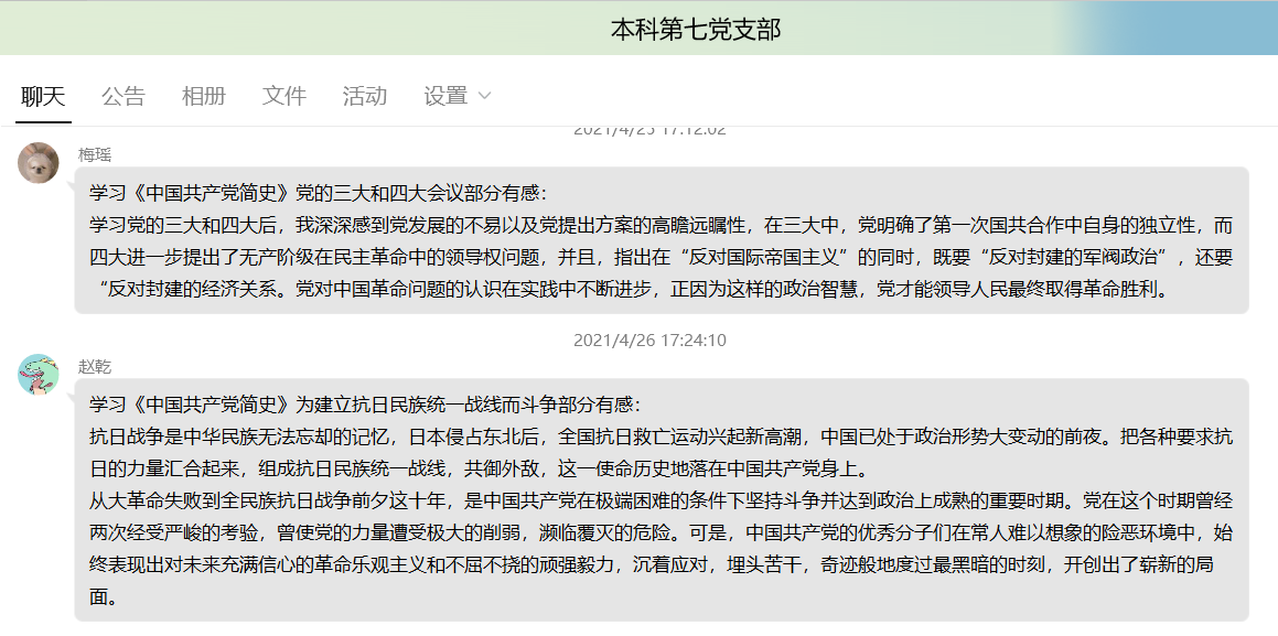 4月15日,七支部积极响应学校“迎建党百年共读活动”,成立阅读示范组,组织全体支部党员共同阅读《中国共产党简史》一书。在为期一个月的共读时间里,党员们每天都坚持阅读,并在党支部群里轮流分享阅读感悟,形成了良好的学习交流党史的氛围。除了线上学习,党员也在线下也各自撰写了一段读书笔记,并由支部骨干将其装订成册,形成了一本具有支部特色的学习语录。