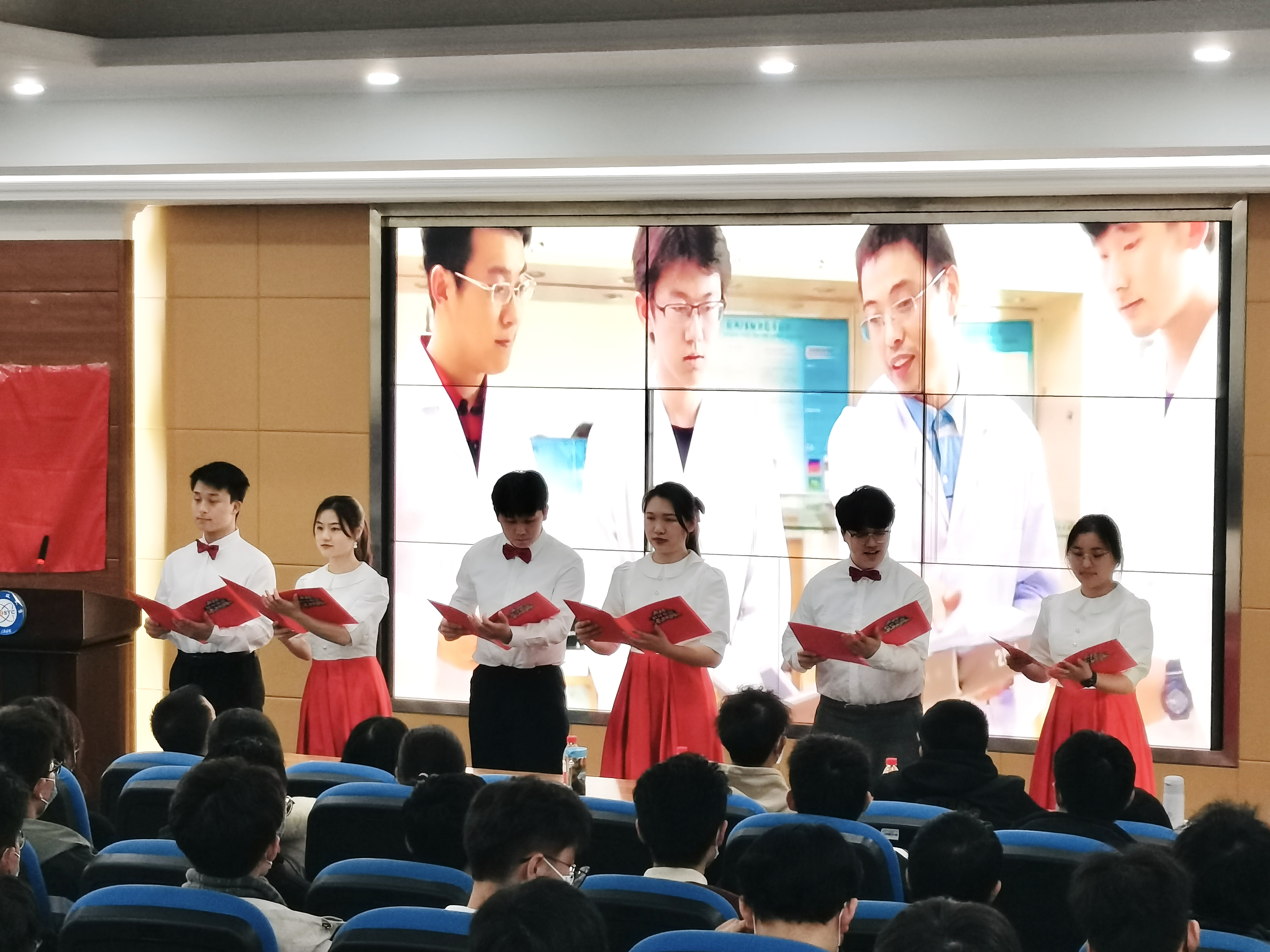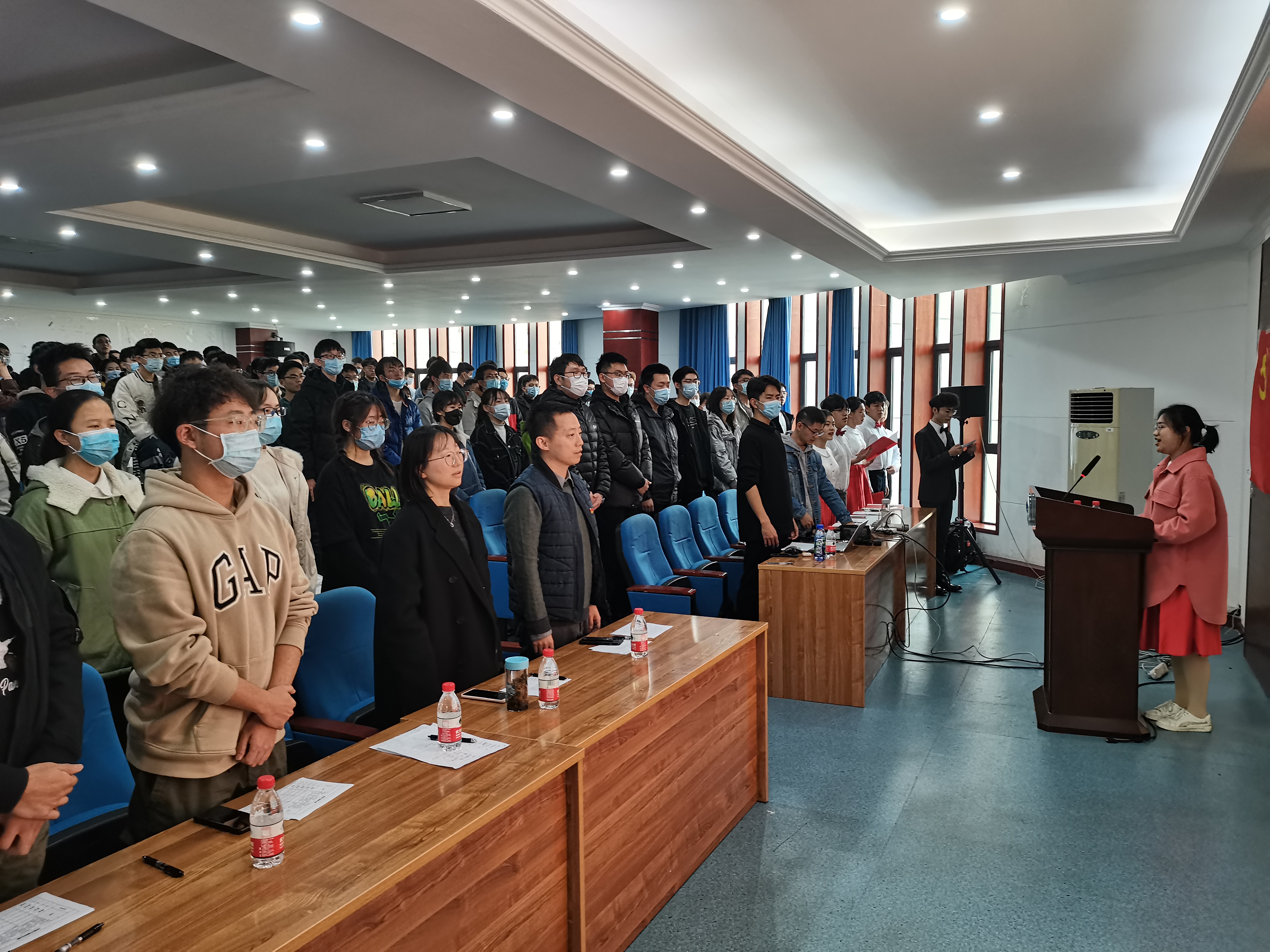 比赛开始前,“5月的向日葵”辅导员工作室下属“星光”大学生红色文化原创剧社成员赵可欣带领全体发展对象共同唱响《国际歌》,庄严的旋律回荡在整个会场。