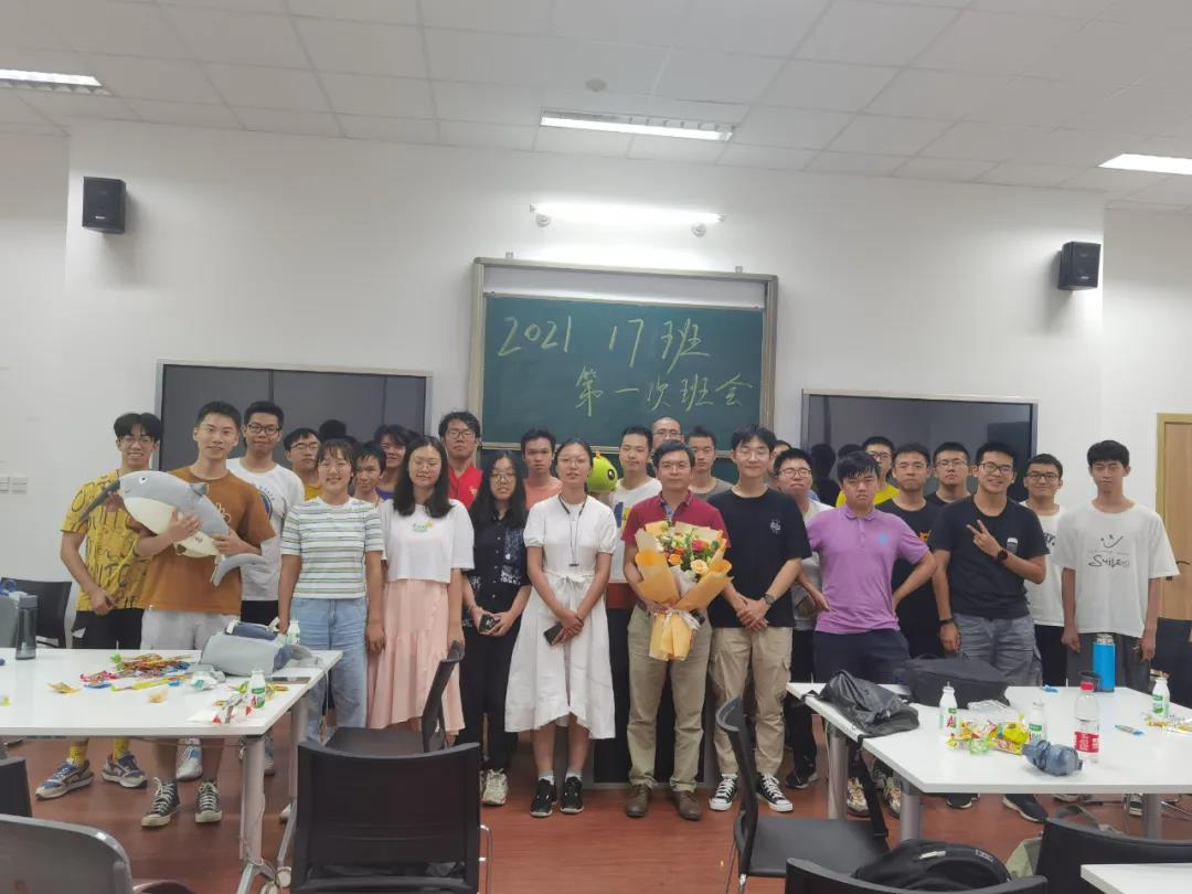 张浩天(左二)和信通学院2020级17班同学们在大二学年的第一次班会