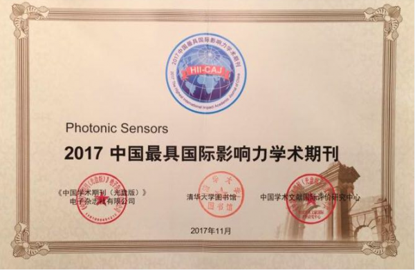 In November 2017, "Photonic Sensors" once again won the "China's Most Internationally Influential Academic Journal" award.